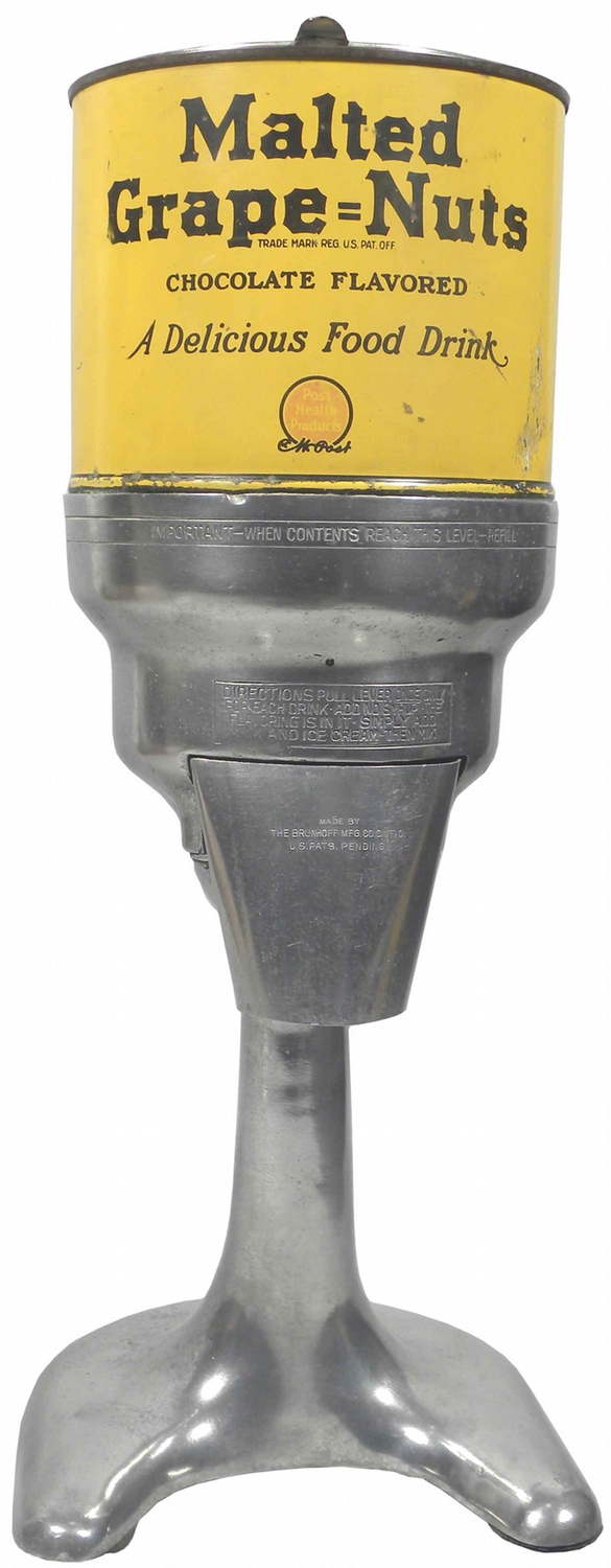 Malted Grape=Nuts Malted Milk Powder Dispenser. Glass lidded tin has some slight paint loss otherwise overall excellent condition. 15 inches tall.