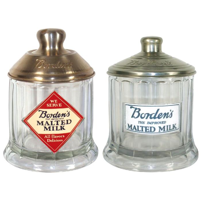 Malted milk containers (2), both Borden's heavy ribbed glass containers w/replacement paper labels & "Borden's" metal lids, knob on one has dent, o/wise both in Exc cond & 8.5"H.
