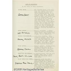 <B>Maltese Falcon (Warner Brothers, 1941)</B></I>Script (147 pages).(9.5" X 11.5"). Do you remember the scene where Kasper Gutman (Sydney Greenstreet) attempts to convince toughguy, Sam Spade, to have a drink? The drink, of course is drugged. If you're a movie fan I'm certain you know the rest of the story. This scene was Mr.Greenstreet's first time in front of a camera. His virgin film performance in this American <B>noir</B></I> classic earned him an Academy nomination and a place in filmdom's history as one of the alltime best bad guys ever. The script from ,"Maltese Falcon," offered here originally was producer, Henry Blanke's copy used in the production of the picture. It was bound at Warner's and includes the full final shooting script complete with 'blue pages' of changes which were added 6/2/41 just prior to the completion of filming. On page two there is a typewritten list of the cast of character. Beside each description is a handwritten notation of the actor scheduled to portray any given character. Just under the Sam Spade listing is clearly written, George Raft. The script is overall in immaculate condition except for the front and back inner cover which show wear. Very Fine/Near Mint.