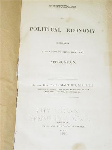 Malthus, Rev. T.R.. Principles of Political Economy Considered With a View to Their Practical Application. Boston: Wells and Lilly, 1821. 8vo - over 7¾" - 9¾" tall. Hard Cover. Ex-Library. Poor condition. RARE - 1ST AMERICAN EDITION. viii, 472pp in a library binding with taped hinges and bumped corners. Interior has some paper tears, some of which are repaired with paper tape. Edge water stain on some pages. BINDING TIGHT.