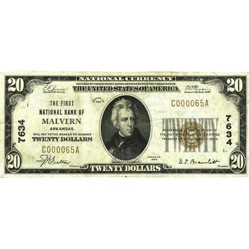 <B>Malvern, AR</B></I> - $20 1929 Ty. 1 <B>The First NB</B></I> Ch. # 7634<BR>A very tough note from the sole bank to issue in rural Hot Spring County. <B>Very Fine.</B></I>