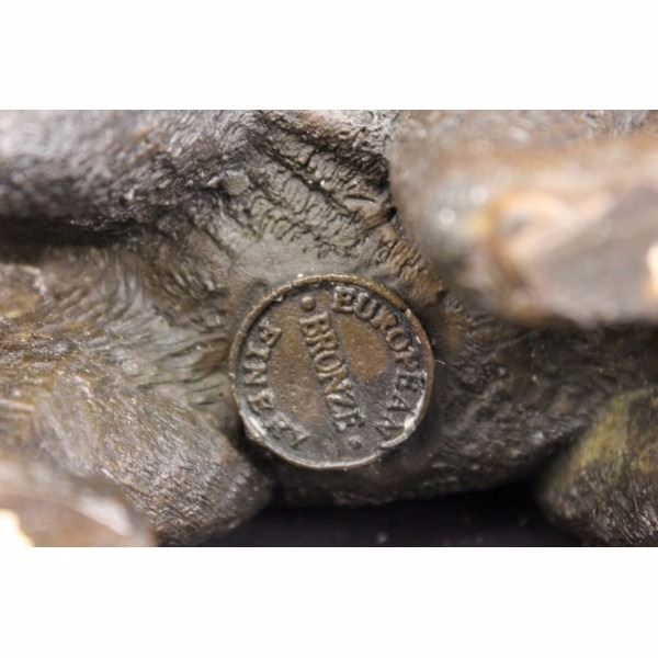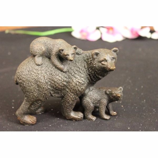 The mother and cubs can be imagined walking in folly along the bank of a roaring river. They all look out at the viewer with a enigmatic almost calm manner as one of the cubs jumps on the mother's back hoping to play. In the Native American spiritualistic beliefs the bear totem signifies primal power, motherhood, cunning, healing, gentle strength, dreaming, sovereignty, intuition married with instinct, nurture and protection. The handmade bronze sculpture was cast using the age-old method of lost-wax casting and stained with a brown patina finish for preservation. It is mounted upon a black marble base with the European Bronze Finery stamp of quality with the artist Milo's signature. The artist Milo lived most of his childhood in Andalusia, Spain. Influenced by an artistic family background, he began sculpting at the age of seventeen. After apprenticing with several accomplished sculptors both in America and Spain, he began his own work focusing equally on steel and bronze. Condition: This sculpture is in perfect condition. Bronze Dimensions :Height 5 1/2" x Width 6 1/2" Weight : 5 LBS Inventory : 27X07642272