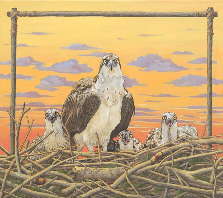 Artist: Marcia Wendel.  Title: Mama Rules, by Marcia Wendel.  Size: 32" x 36".  Description: "The osprey is such a beautiful fisherman and its habitat spans from Florida to Montana, which really surprised me.  He carries the fresh catch in his claws like one carries a torpedo with the head facing forward. The male then eats the head of the fish before transporting the food to the nest. In other words, Mama wants her food prepared properly before the chicks dine on the catch of the day.  Smart lady." -M.W.