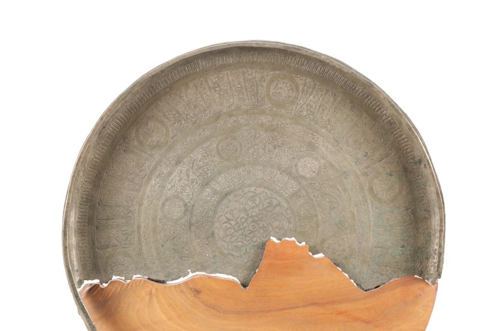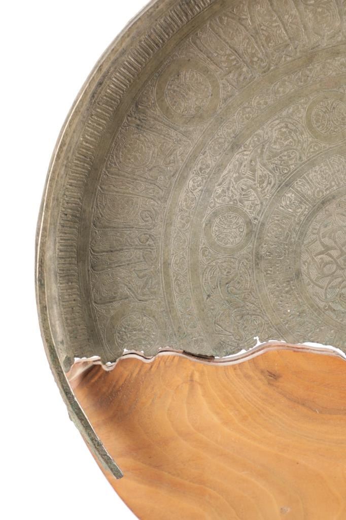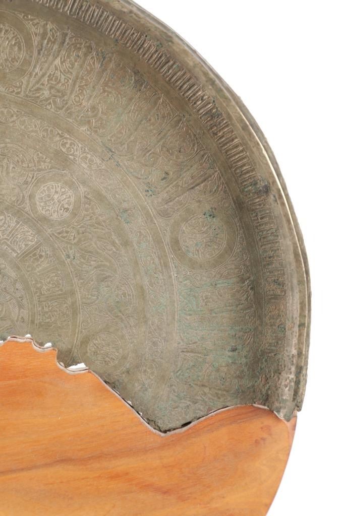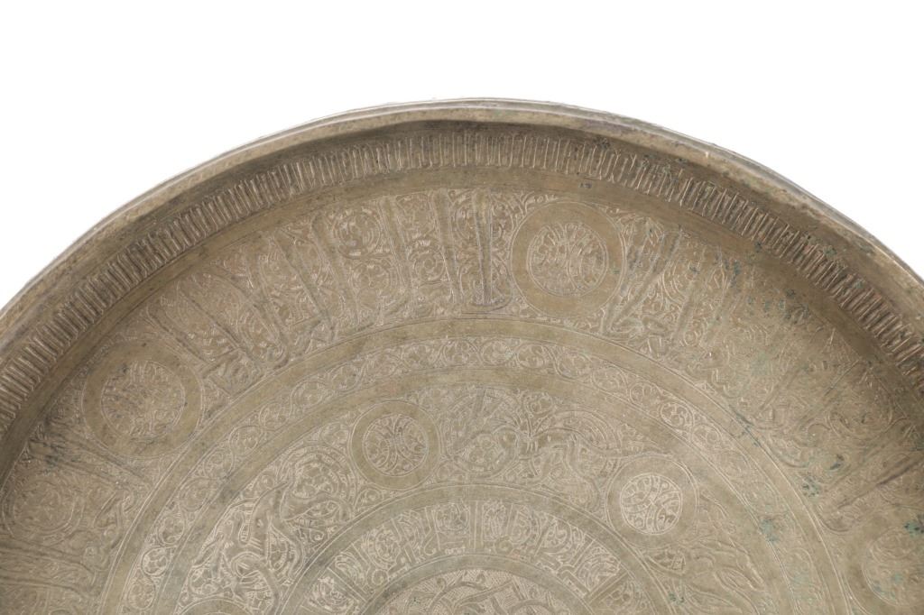 For your consideration is this Mameluke Dynasty Islamic Bronze Platter fragment, circa 11th - 14th century AD. Procured in Afghanistan 1969-1972. Provenance: the Owen D. Mort, Jr. Collection. Owen David Mort was an American engineer who amassed an impressive collection throughout his worldwide travels. His collection has included art, artifacts and other historical items from which he has donated to museums at the University of Utah and the Snite Museum of Art at the University of Notre Dame, also including African, Afghan, Indian, Mughal, Parthian, Persian and Far East Asian art and artifacts. A similarly aged platter / tray has been on display at the Metropolitan Museum of Art in New York City, another platter / tray is illustrated in the classic reference book, "Gold, Silver and Bronze From Moghul India" by Mark Zebrowski, page 35. In the Mameluke period, luxury objects such as the present tray were produced in specialized workshops. Such production was fueled by the strong tradition of patronage, especially relating to architectural projects, across the Mameluke domains of Egypt, Syria, and the Hijaz. With the construction of new religious buildings such as mosques and madrasas, and also with secular urban expansion, there was an increased demand for the manufacture of both practical and ornamental objects. The program of urban and cultural expansion stimulated production of glass and metalwork. The Mameluke (also spelled Mamluk) Dynasty (Sultanate) was a dynasty which ruled Delhi Sultanate as well as held political and military power most notably in Egypt, but also in the Levant, Iraq, and India. Metalwork has always been to India what ceramics are to China. During the fabled Mughal age, the craftsmen of the Sultans and Rajahs of India produced an astonishing variety of objects in gold and gold enamel, silver, brass, bronze, gilt copper and the Deccani alloy known as bidri. The finest of these are among the most striking and poetic utilitarian wares ever made, in addition to being of the most outstanding technical refinement. This circular platter / tray fragment features hand chased and embossed with Islamic thuluth calligraphy, floral and geometric designs in Mameluke style. Thuluth script is a medieval Islamic style of handwritten alphabet. It is a large and elegant, cursive script, used in medieval times on mosque decorations. it was used to write sura headings, religious inscriptions, and princely titles and epigraphs. Starting with the rim exterior, the engraving continues into the interior featuring concentric depictions of animals, calligraphy, floral and geometric designs.
