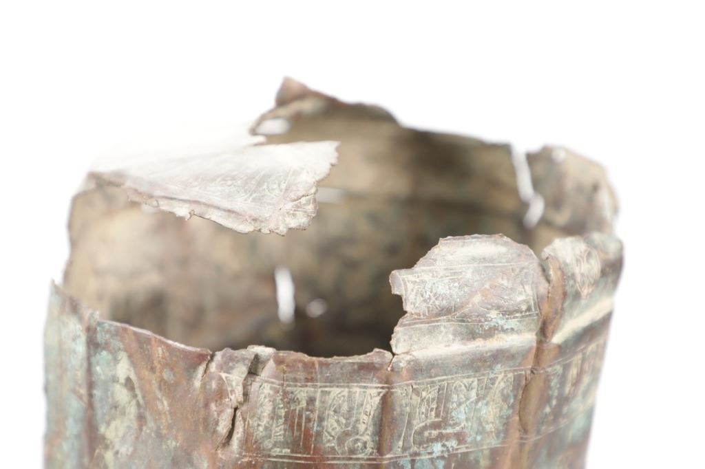 For your consideration is this Mameluke Dynasty Islamic Copper Pitcher Vase fragment, circa 11th - 14th century AD. Procured in Lashkar Gah, Afghanistan 1969-1972. Provenance: the Owen D. Mort, Jr. Collection. Owen David Mort was an American engineer who amassed an impressive collection throughout his worldwide travels. His collection has included art, artifacts and other historical items from which he has donated to museums at the University of Utah and the Snite Museum of Art at the University of Notre Dame. Donations also include Afghan, Indian, Mughal, Parthian, Persian and Far East Asian art and artifacts. In the Mameluke period, luxury objects were produced in specialized workshops. Such production was fueled by the strong tradition of patronage across the Mameluke domains of Egypt, Syria, and the Hijaz. With the construction of new religious buildings such as mosques and madrasas, and also with secular urban expansion, there was an increased demand for the manufacture of both practical and ornamental objects. The program of urban and cultural expansion stimulated production of glass and metalwork. The Mameluke (also spelled Mamluk) Dynasty (Sultanate) was a dynasty which ruled Delhi Sultanate as well as held political and military power most notably in Egypt, but also in the Levant, Iraq, and India. Metalwork has always been to India what ceramics are to China. During the fabled Mughal age, the craftsmen of the Sultans and Rajahs of India produced an astonishing variety of objects in gold and gold enamel, silver, brass, bronze, gilt copper and the Deccani alloy known as bidri. The finest of these are among the most striking and poetic utilitarian wares ever made, in addition to being of the most outstanding technical refinement. This pitcher / vase fragment features hand chased and embossed with Islamic thuluth calligraphy, bird, floral and geometric designs in Mameluke style. Thuluth script is a medieval Islamic style of handwritten alphabet. It is a large and elegant, cursive script, used in medieval times on mosque decorations, and it was used to write sura headings, religious inscriptions, and princely titles and epigraphs. According to the Department of Islamic Art at the Metropolitan Museum of Art, "Geometric patterns make up one of the three nonfigural types of decoration in Islamic art, which also include calligraphy and vegetal patterns. Whether isolated or used in combination with nonfigural ornamentation or figural representation, geometric patterns are popularly associated with Islamic art, largely due to their anionic quality. These abstract designs not only adorn the surfaces of monumental Islamic architecture but also function as the major decorative element on a vast array of objects of all types. While geometric ornamentation may have reached a pinnacle in the Islamic world, the sources for both the shapes and the intricate patterns already existed in late antiquity among the Greeks, Romans, and Sasanians in Iran. Islamic artists appropriated key elements from the classical tradition, then complicated and elaborated upon them in order to invent a new form of decoration that stressed the importance of unity and order. The significant intellectual contributions of Islamic mathematicians, astronomers, and scientists were essential to the creation of this unique new style." This pitcher / vase is a heavy gauge copper, the top spout and large portion of the top is missing, handle is missing. Splits and corrosion damage observed. Greenish oxidation patina noted throughout along with original copper gilt. Measures 9"H x 6.5"W, 4" diameter foot base; weight is 2lb 4oz.*