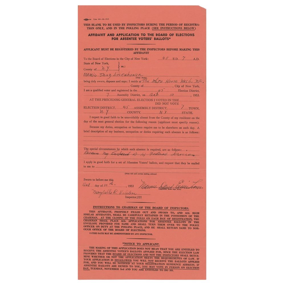 DS, one page, 7.25 x 15.5, October 10, 1953. Eisenhower's "Affidavit and Application to the Board of Elections for Absentee Voters' Ballots," filled out in her hand with her residence as ‰ÛÏThe White House, Wash. D.C.,‰Û and the circumstances for her absence as ‰ÛÏbecause my husband is in Federal Service." She also prints her name in capital letters, and signs in cursive at the conclusion. In fine condition, with multiple horizontal folds. Absentee ballots were not always controversial, but were a part of the basic framework of elections since the late 19th century.åÊ Given her busy schedule, The First Lady prepares in advance to vote‰ÛÓcertainly in the 1953 New York Mayoral race. From the family of James Siket, Executive Director of the New York City Board of Elections at the time.