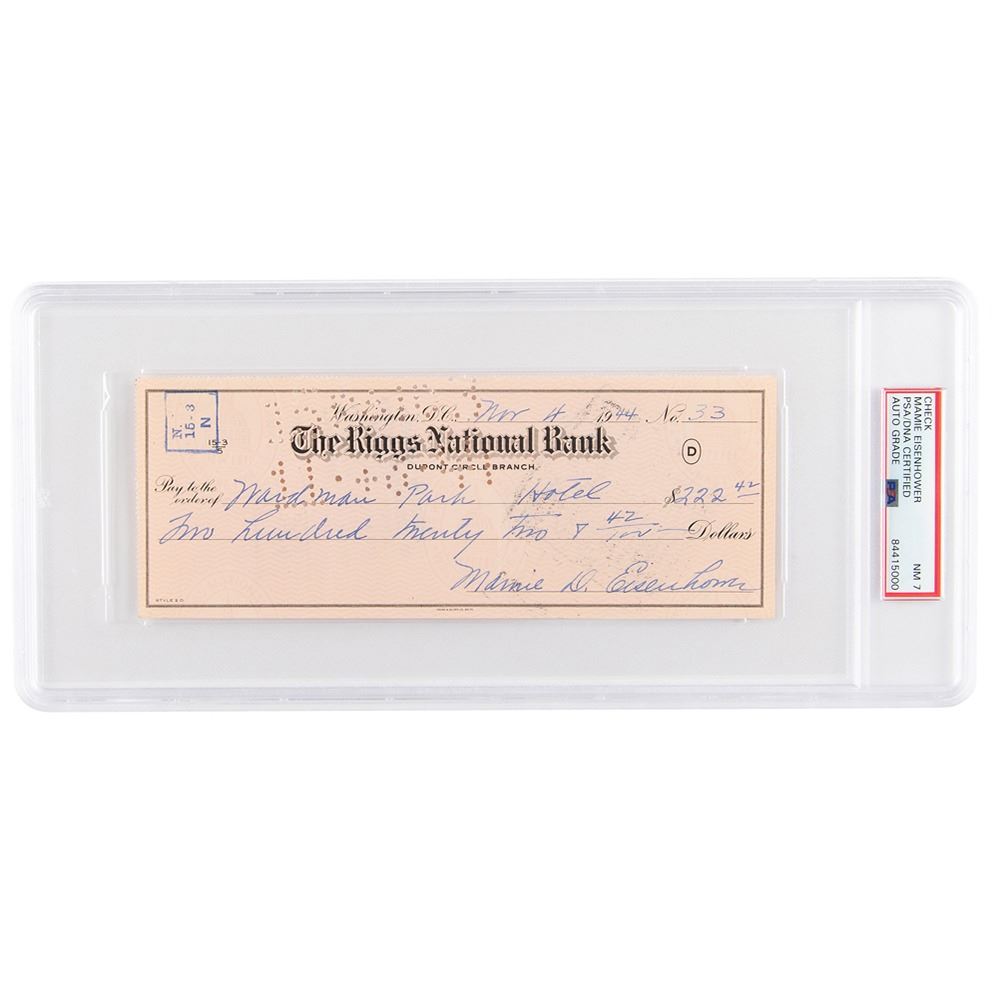 War-dated Riggs National Bank check, 8.25 x 3, filled out and signed by Eisenhower, "Mamie D. Eisenhower," payable to the Wardman Park Hotel for $222.42, November 4, 1944. In fine condition. Encapsulated in a PSA/DNA authentication holder, grading the autograph as "NM 7."