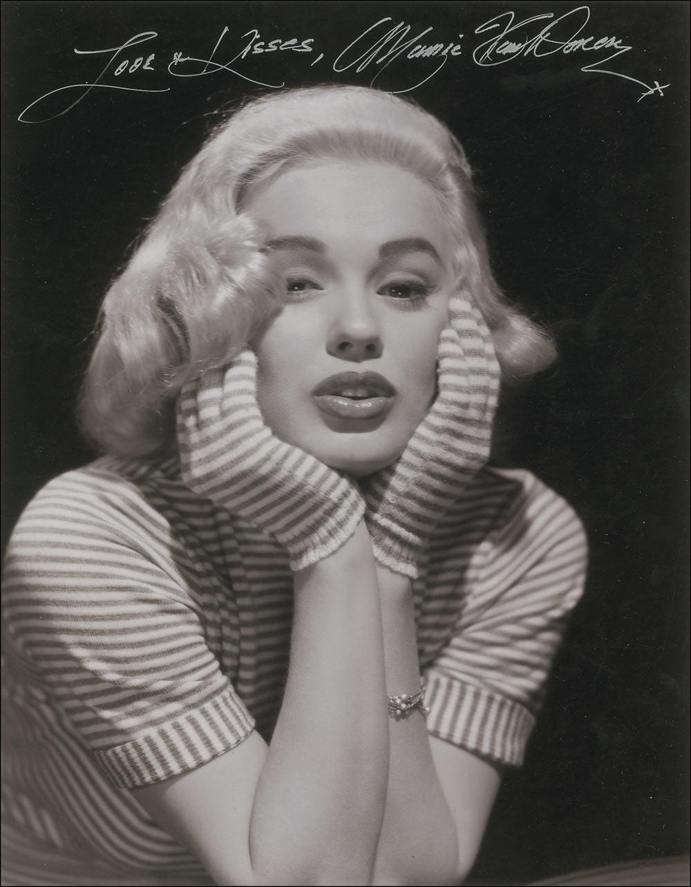 Glossy 11 x 14 photo of Van Doren with her face perched in her hands, signed in silver ink, “Love & Kisses, Mamie Van Doren.” In fine condition, with trivial surface rubbing and some light brushing to the signature.