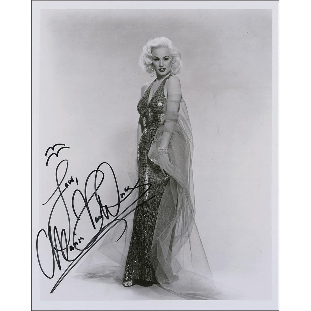 Stunning glossy 8 x 10 full-length photo of Van Doren in a shimmering gown, signed in black felt tip, “Love, Mamie Van Doren.” In fine condition.