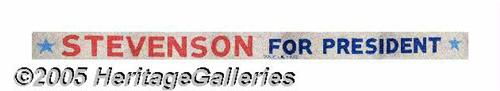 <B>Mammoth Canvas 1956 Adlai Stevenson Headquarters Banners</B></I> Painted on medium-weight canvas. Basically excellent, with very minor light soiling staining. Each measures 16 inches tall by 25 feet in length. Lot:264