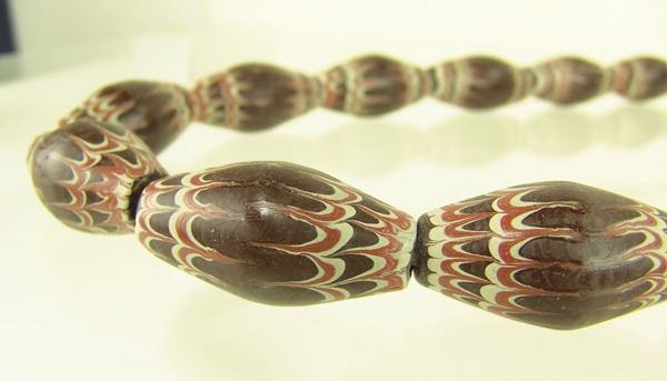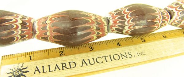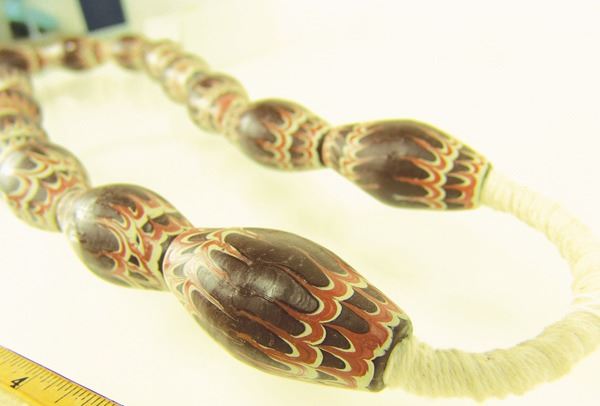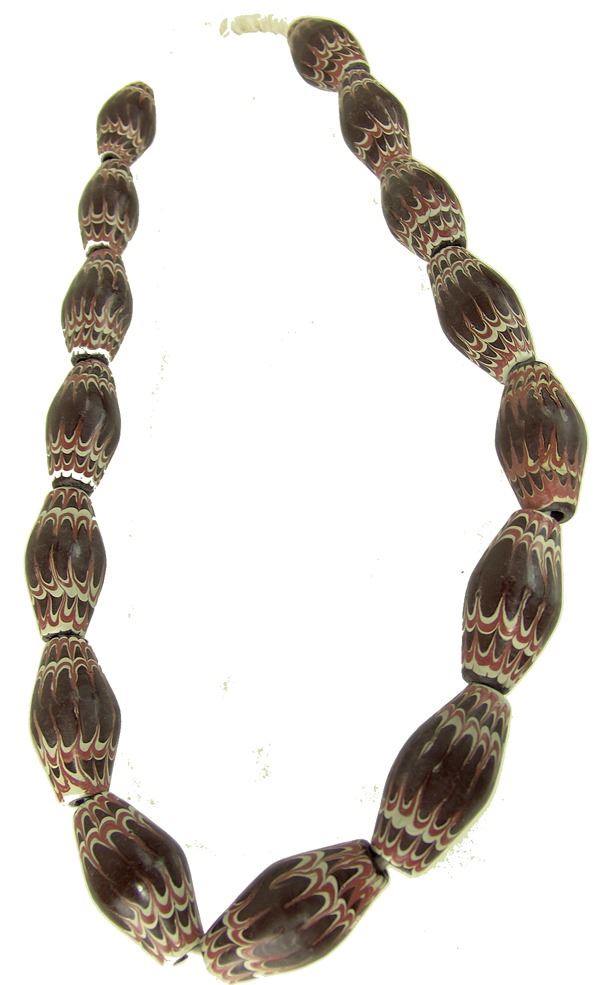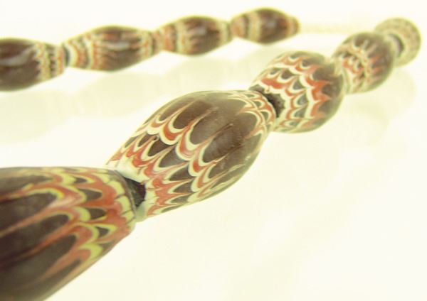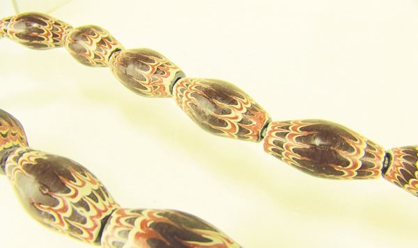 Impressive, long strand of biconical, nine-layer glass beads, 2-1/2" x 1-3/8" each, in brown, tan, and brick. Very good condition.Late 1900s31"