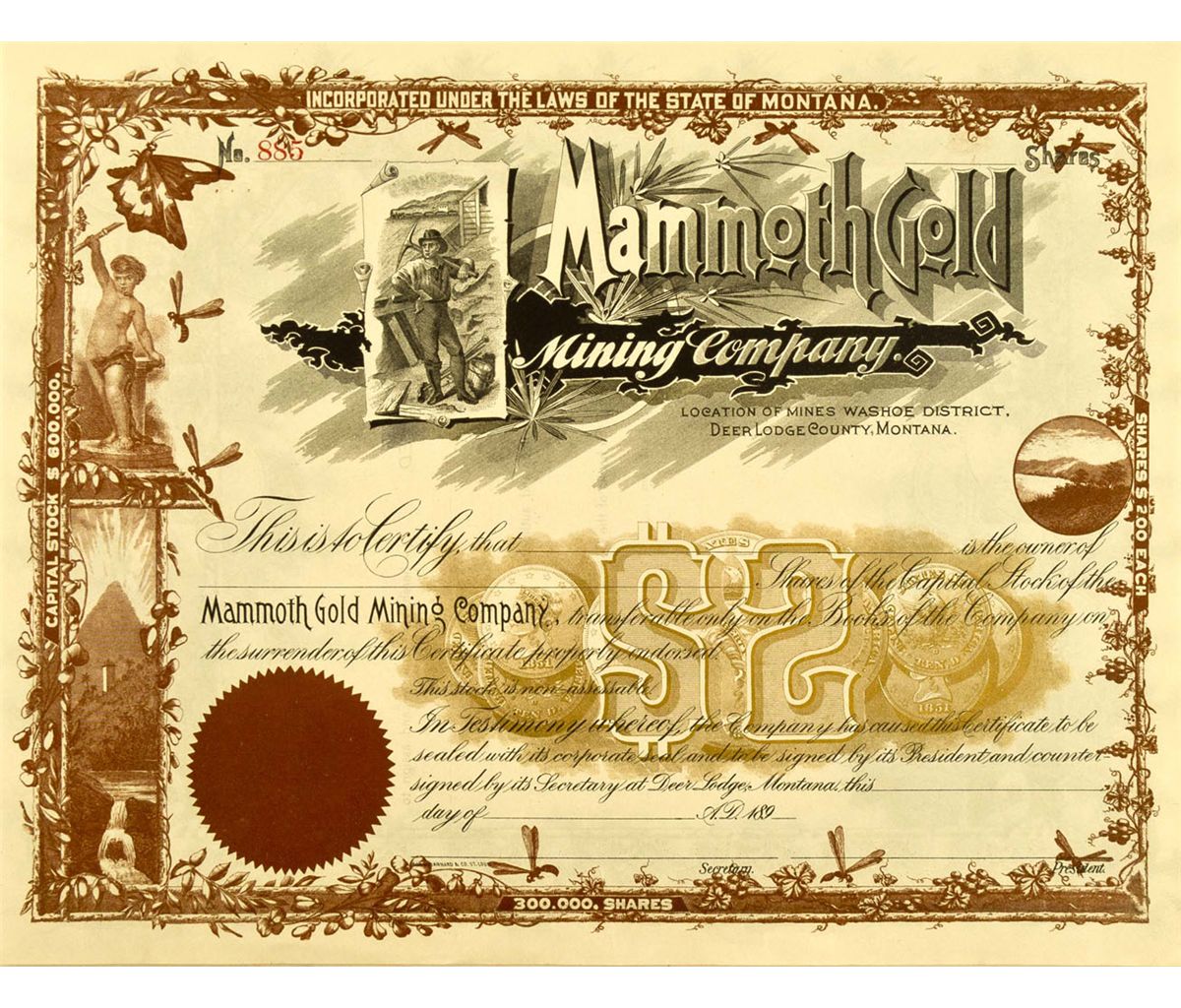 Washoe District. Incorporated in Montana. Unissued, unsigned certificate #885. Beautiful masthead with company name and inset vignette of a miner standing at a diggings with a pickaxe over his shoulder. “Location of Mines Washoe District, Deer Lodge County, Montana” is printed beneath masthead. Ruse colored borer and seal with vignettes incorporated along the border, consisting of a butterfly, dragonflies, bee, an allegorical boy leaning on a birdbath, and a vine covered building at bottom with small waterfall in foreground. Printer: Geo. D. Barnard & Co., St. Louis. Under print shows coins in gilt, and on reverse there are more coins depicted. 9 x 11.5.” From the Montana state government website: “The Coloma mining district is located in the northeastern corner of the Garnet Range at the headwaters of McGinnis Creek, a tributary of Elk Creek which flows north into the Blackfoot River. The mining camp known as Coloma was on the north side of the divide from the camp of Garnet which was at the headwaters of Bear Gulch, a tributary of the Clark Fork River. Between 1897 and 1916 the Coloma district production totaled approximately $250,000. In 1916 the only mine being developed was the Mammoth, by the Montana Gold Mines Company. The district produced again from 1918-1921 and 1932-1950 (Kauffman & Earll 1963).”