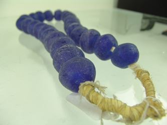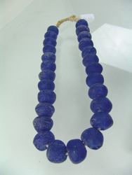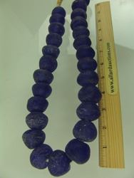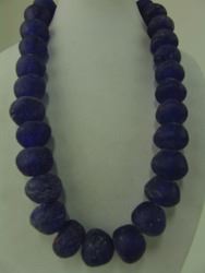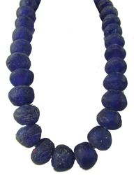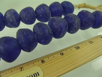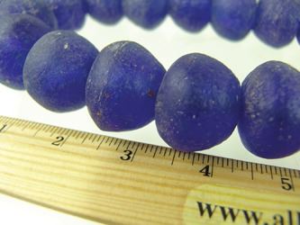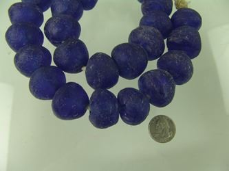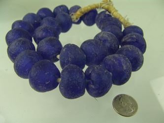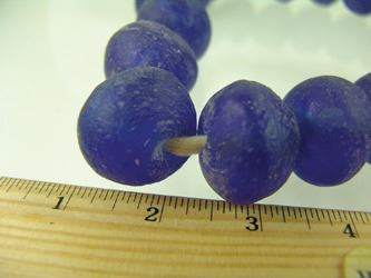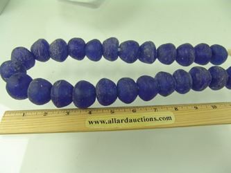 Single strand of deep blue, Dutch "sea glass" beads that are 40mm (1-1/2") in diameter and molded in the traditional way with recycled glass. Very good condition, with the natural cracks and imperfections that these normally have. Early 1900s. 30"