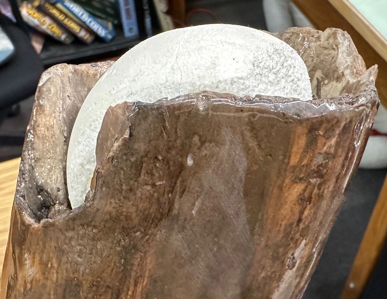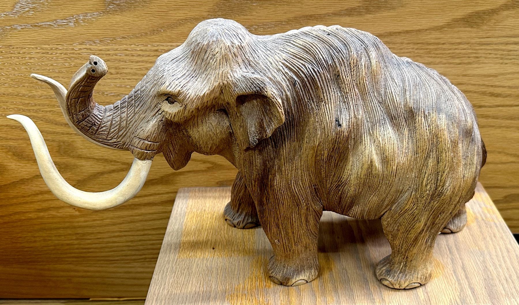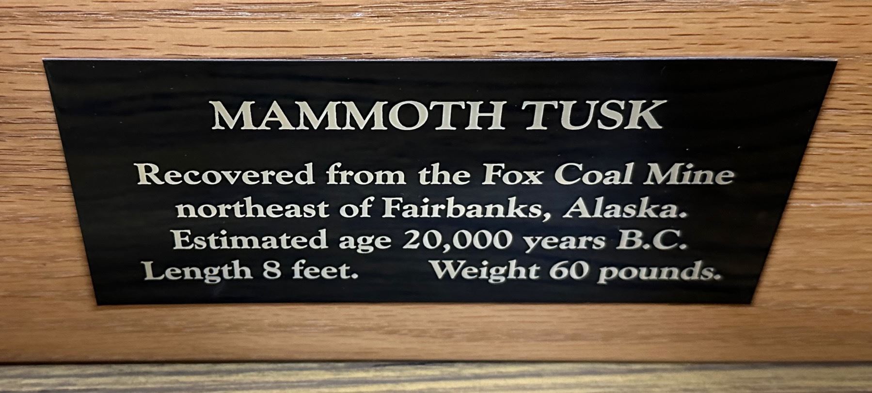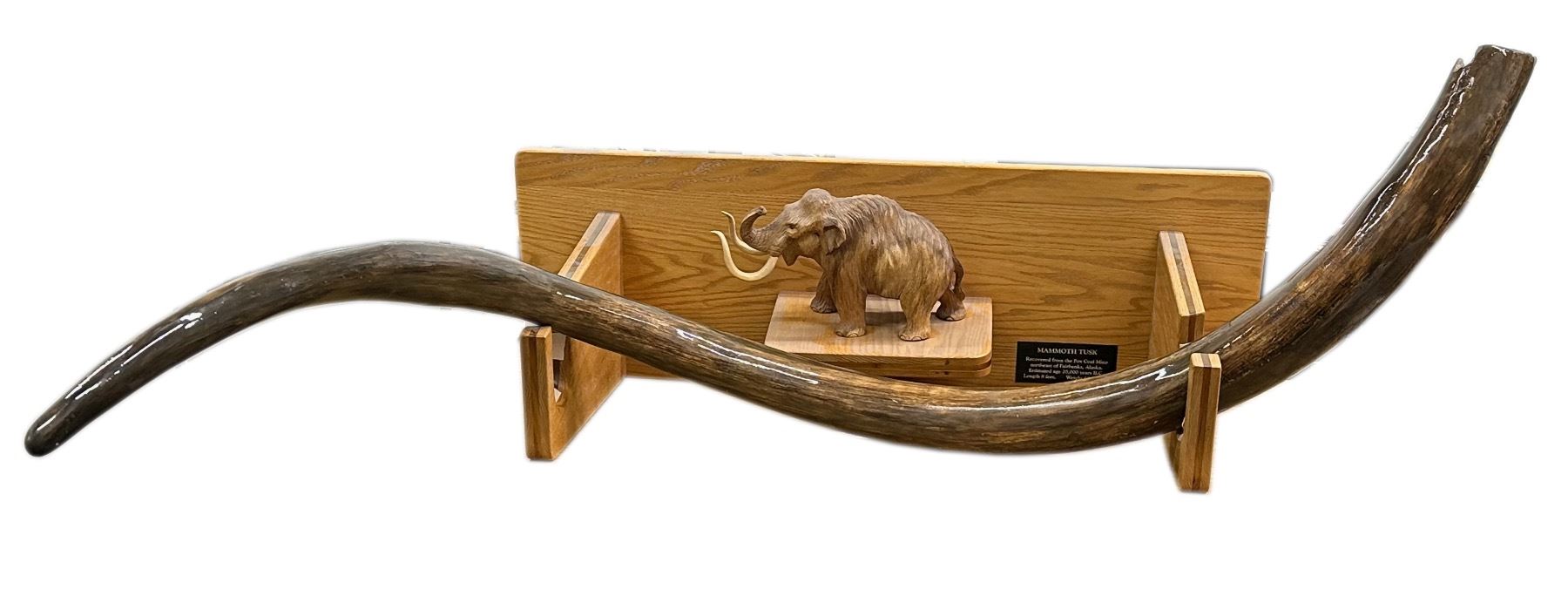 Fantastic mammoth tusk found at the Fox Coal Mine northeast of Fairbanks, Alaska. 8 feet long, 60 lbs. Approx. 20,000 BC. Comes with wooden wall mount and miniature mammoth statue. Has been stabilized with some sort of epoxy. We have sold photographs of Alaska miners uncovering tusks before. Very rare intact fossil. Pick-up only.