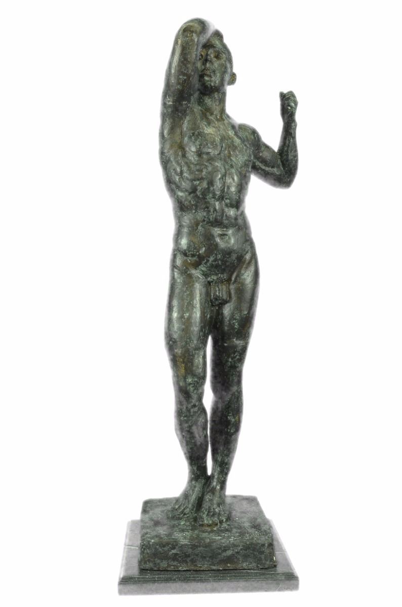 The Lively Modeling Of The Nude And Its Deceptively Realistic Appearance Represented Such A Departure From The Conventions Of Academic Sculpture Of The Time That Rodin Was Accused Of Casting From A Live Model, A Practice Greatly Frowned Upon. Rodin Preserved Photographs Of The Human Model On Which The Sculpture Is Based, A Man Named Auguste Neyt. He Is Shown Nude, His Clenched Right Hand On His Head And His Left Hand Grasping A Pole. It Is Immediately Evident That The Sculpture Was Not Cast From The Body Of The Man. Critics Of The Period Were Also Dismayed By The Subject, For Rodin Not Only Abandoned All Of The Elaborate Repertory Of Symbols With Which Academic Sculptors Habitually Equipped Their Works, But Also Had Stripped The Figure Of The Spear Originally Carried In His Left Hand, Relying On The Expressiveness Of The Figure Itself To Convey Its Meaning. In Addition, He Changed The Title From The Vanquished (Le Vaincu), Possibly An Allusion To The Suffering And Demoralization Of His Countrymen During The Franco-Prussian War, To The Classical, But More Ambiguous, The Age Of Bronze (L'Âge D'Airain). Later The Work Acquired Still Other New Titles. The Metropolitan Museum Has Retained The Title By Which The Bronze Was Known At The Time Of Its Purchase From Rodin. Bronze Dimensions With Marble Base: Height 37 X Width 11 inches. Weight: 36 Lbs. Please Note: This is a reproduced bronze sculpture from the original molded and signed. This featured bronze sculpture is a recast after the original, and has been done recently. This 100% bronze sculpture is an abstract piece certain to be a conversation piece.