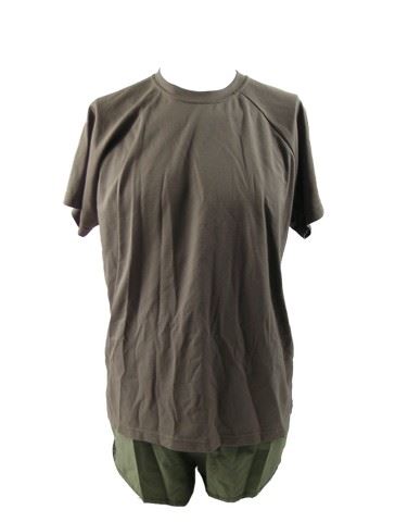 Gabriel Drummer (Shia LaBeouf) screen worn, distressed with holes, army green short sleeve crew neck 'Duke' t-shirt, (size L) and green drawstring waist 'Soffe' workout shorts. (size L)