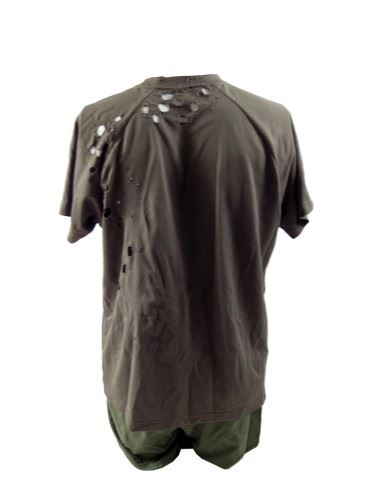Gabriel Drummer (Shia LaBeouf) screen worn, distressed with holes, army green short sleeve crew neck 'Duke' t-shirt, (size L) and green drawstring waist 'Soffe' workout shorts. (size L)