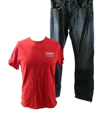 Gabriel Drummer (Shia LaBeouf) screen worn, hero, red short sleeve crew neck with Jacksonville logo on the front 'Gildan' t-shirt, (size M) and medium wash denim straight leg 'Levi' jeans. (size 32 x 32) Includes wardrobe tag.