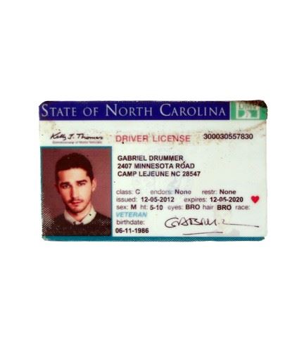 Gabriel Drummer (Shia LaBeouf) screen used, hero, State of North Carolina drivers license. (approx. 3 1/2" x 2")