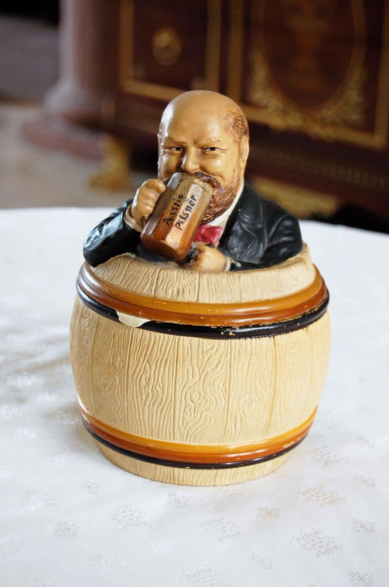 Man Drinking Beer Humidor, ceramic. Small chip on lid otherwise very good condition. Aprox 6 inches tall.