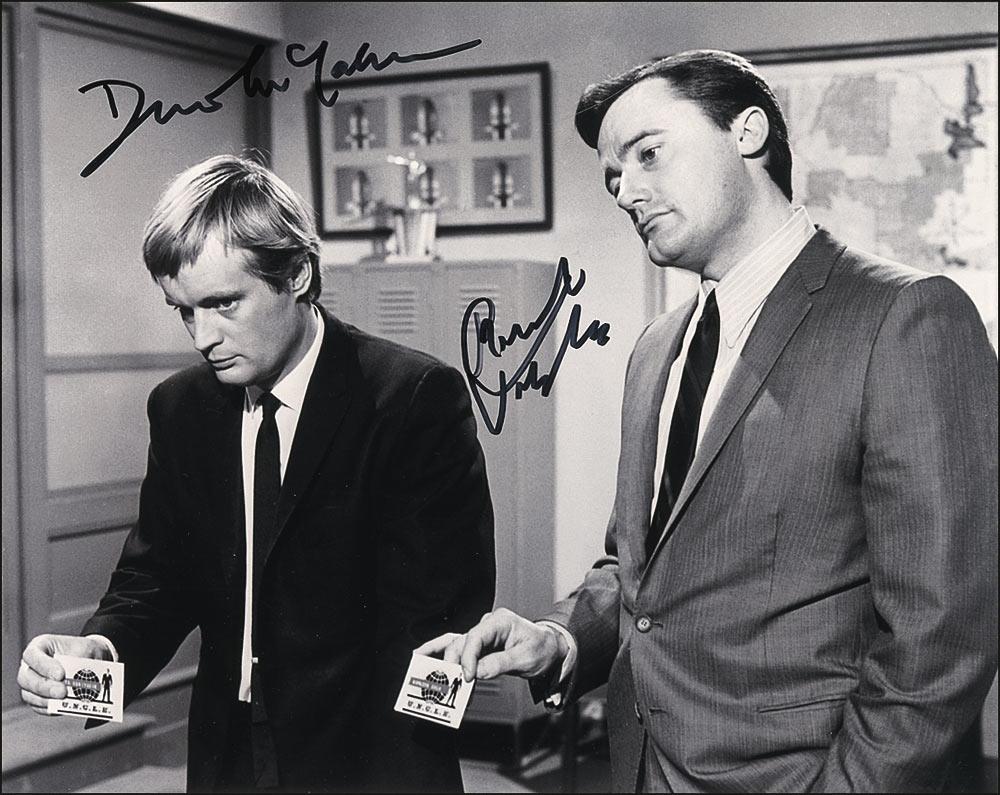 Glossy 10 x 8 photo of the secret agents flashing their cards, signed in black felt tip by Robert Vaughn and David McCallum. In very fine condition.