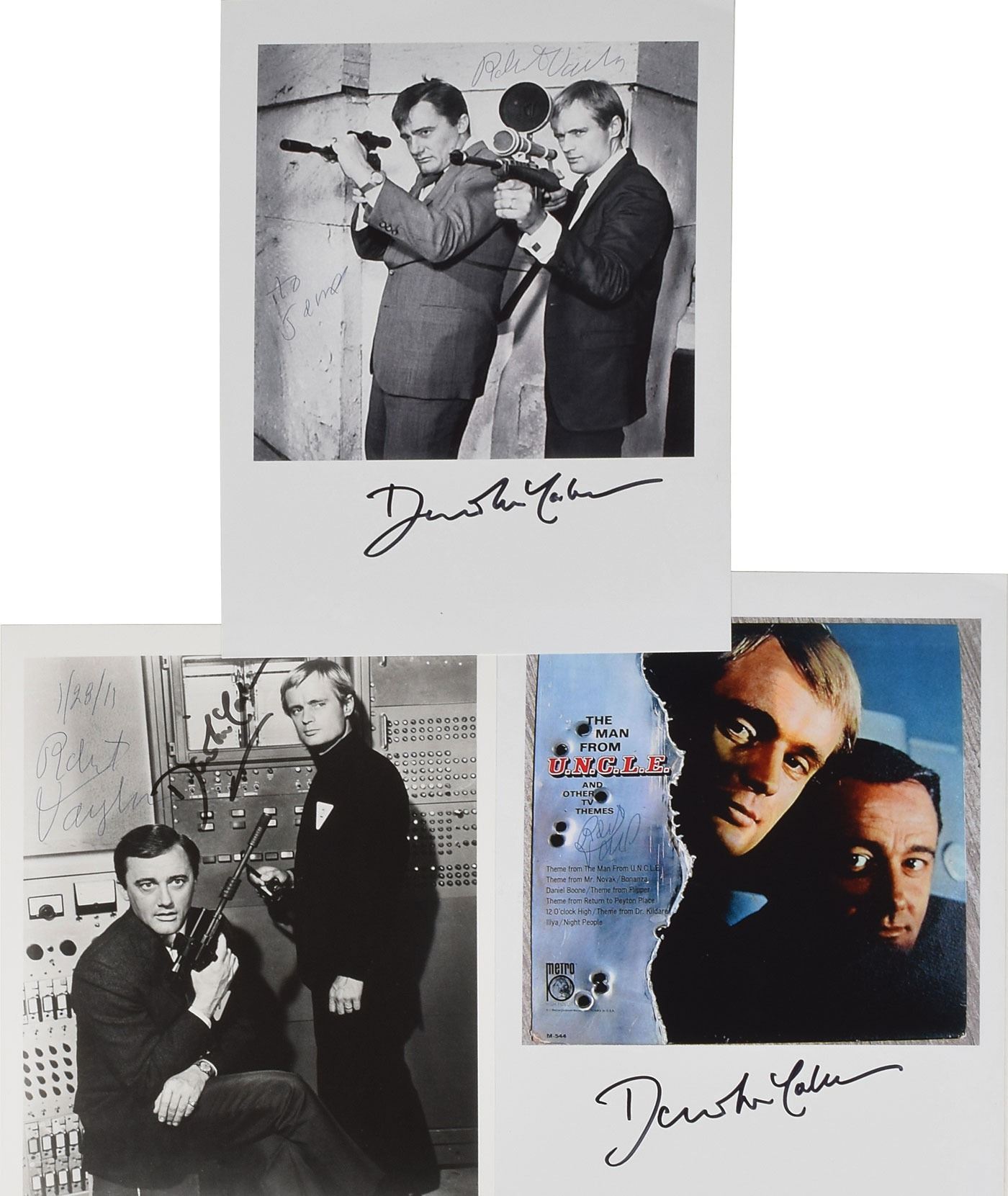 Set of three glossy photos of the two stars from The Man from U.N.C.L.E., one 8 x 10 and two 8.25 x 11 (both laser print photos), each signed in black felt tip by David McCallum and in ballpoint by Robert Vaughn, who adds an inscription to one, "To Jamie," and the date to another, "1/28/11." In overall fine condition.