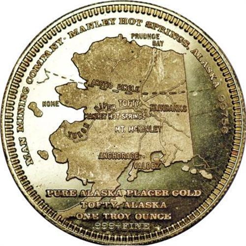<B>Man Mining Co., Manley Hot Springs, Alaska.</B></I> Gold, 32.5 mm. One oz. .999+ fine gold medal, obverse features a map of Alaska with mining location; the reverse has a spread eagle with United States of America above and In Gold We Trust at the bottom. <BR> <BR> <BR><BR><b>Shipping:</b> Coins & Currency (<a target="_blank" href="http://www.heritageauctions.com/common/shipping.php">view shipping information</a>)