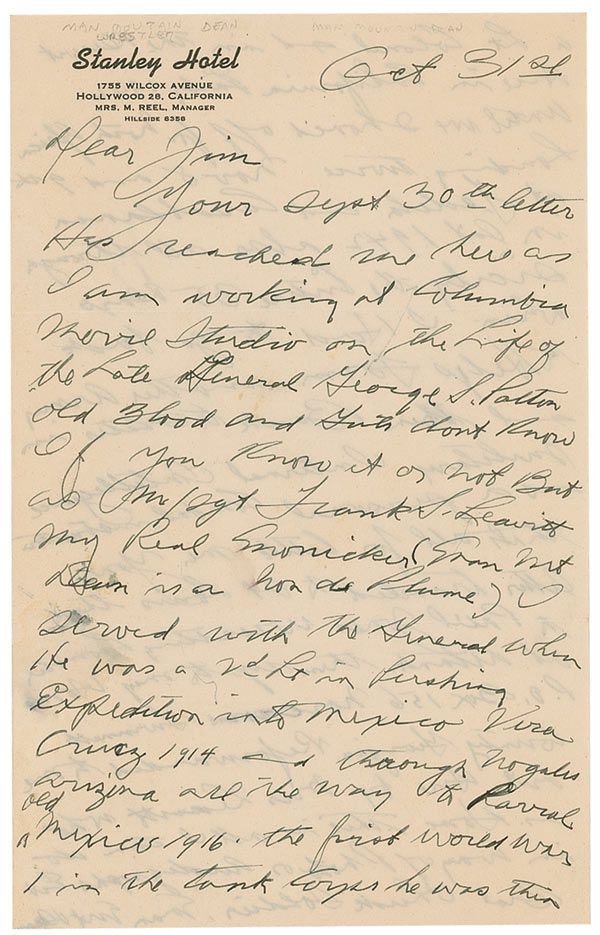 Professional wrestler of the early 1900s. ALS signed “Man Mt Dean,” one page both sides, 6 x 9.25, Stanley Hotel letterhead, October 31. Letter to a friend. In part: “I am working at Columbia Movie Studio on the Life of the Late General George S. Patton Old Blood and Guts don’t know it or not but as M/Sgt Frank S. Leavitt my real monicker (Man Mt Dean is a nom de Plume) I served with the General when he was a 2nd Lt in Pershing Expedition into Mexico Vera Cruz 1914 and through Nogales Arizona…the first world war I in the tank Corps…until we shoved off for North Africa landing twice…also all through Sicily…then back to states in military Internal Intelligence as a personal combat instructor.” In fine condition, with a uniform shade of toning and a couple trivial spots. Very interesting first-hand account of Dean’s prominent military career serving along side the legendary general, with the inclusion of his real name, makes this a letter of exceptional content and quality. Accompanied by a letter of authenticity from James Spence.