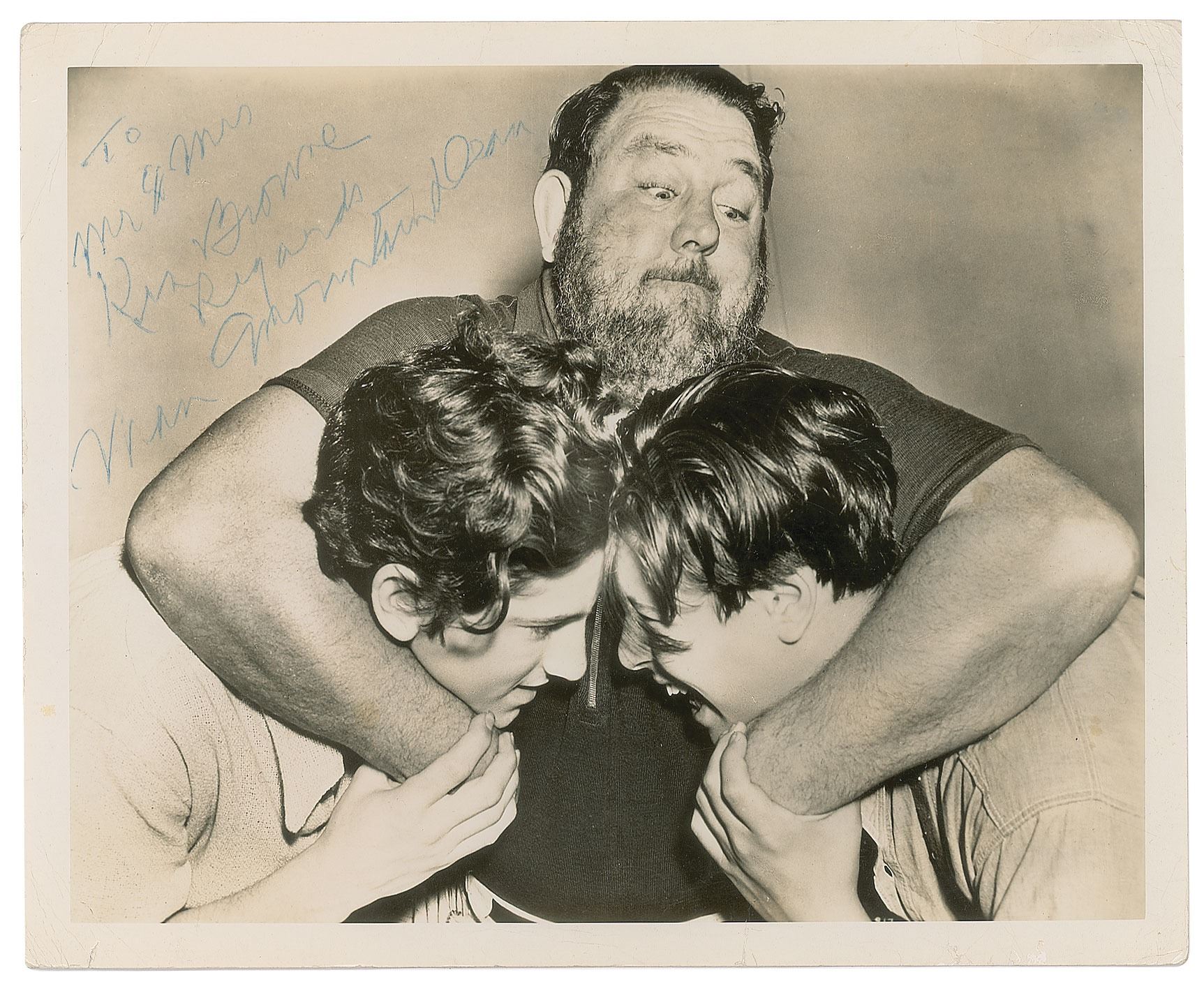 Professional wrestler and movie star (1891–1953) of the early 1900s who participated altogether in 6,783 professional bouts. Very uncommon vintage glossy 10 x 8.25 photo of Man Mountain Dean putting two members of the Dead End Kids in headlocks on the set of Little Tough Guys in 1937, signed and inscribed in blue ballpoint, "To Mr. & Mrs. Ken Browne, Regards, Man Mountain Dean.” Typed collector's notation on reverse indicates that the autograph was obtained in March 1952. In very good condition, with overall creasing, light silvering, and surface impressions from notations on the reverse.