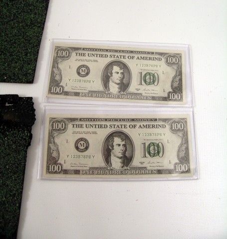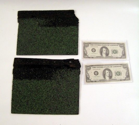 From "Man of Steel" (2013), two screen used $100 bill props in archival sleeves from the Smallville destruction scene, plus an original roof tile from the Oswego IL farmhouse set built for the film. This was obtained from the scene when General Zod attacks and destroys the front porch of the building. Includes a COA. (roof piece approx. 9" x 7 1/2").