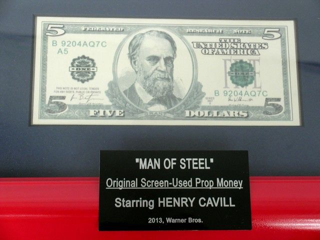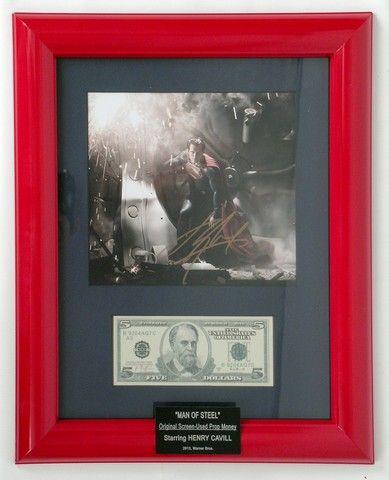 Framed autographed photo of Clark Kent/Superman (Henry Cavil) from the film "Man of Steel". Also framed prop $5 bill used during filming. COA from Todd Mueller Autographs for the photo and letter of provenience for the prop money. Custom display case is approx. 17" x 14".