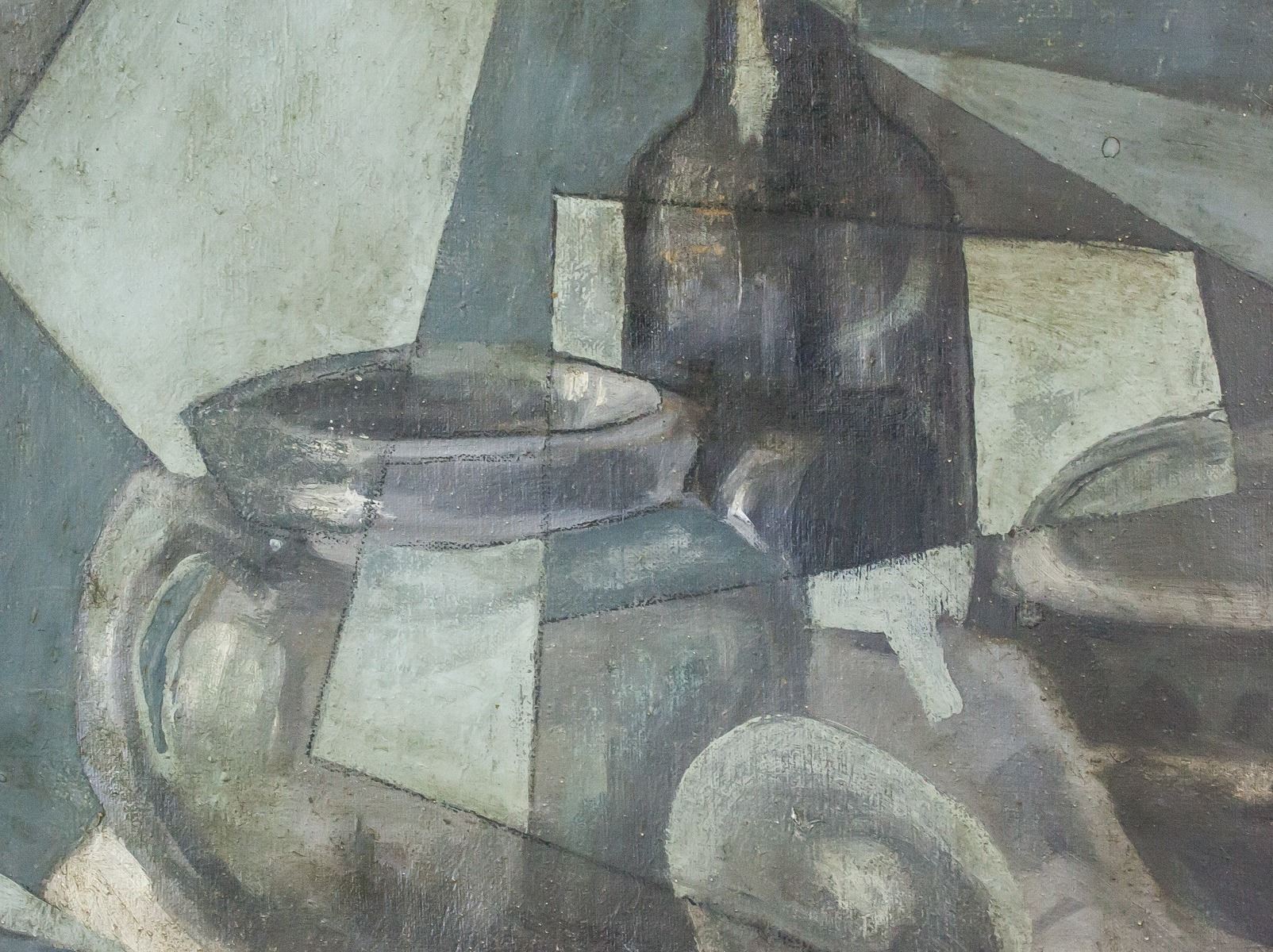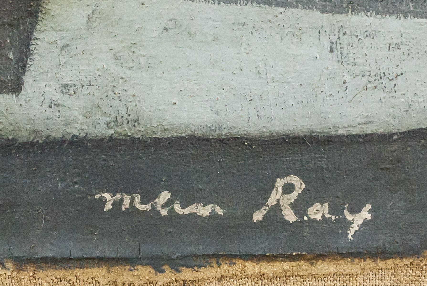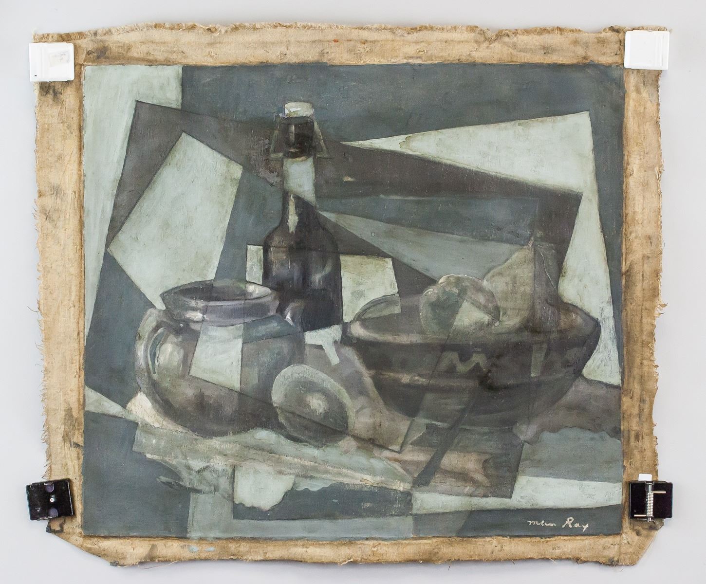 Oil on canvas. Featuring still-life in gray-scale. Signed "Man Ray" in the bottom right corner. "BAG5" stamped on verso. Paper affixed to verso reads "Man Ray Nature Morte Matt". Faint illegible stamp in blue on verso. Attributed to May Ray (1890-1976, American). 52 x 59 cm (20.5 x 23 inches). PROVENANCE: This lot carries limited provenance from an Eastern European collection
