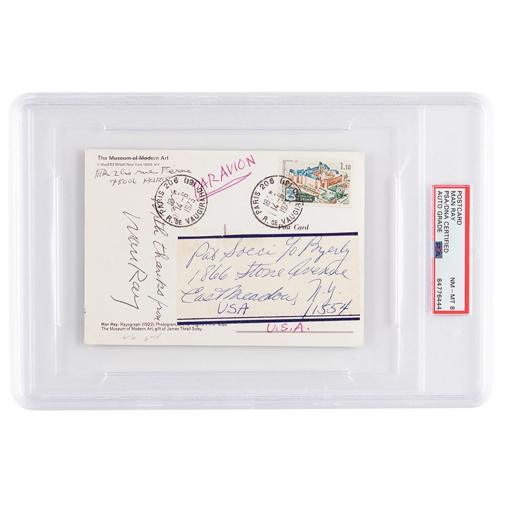 Semi-glossy 5.75 x 4 postcard from the Museum of Modern Art featuring Man Ray& rsquo;s 1922 work & lsquo;Rayograph,& rsquo; postmarked in Paris on June 14, 1973, signed vertically on the reverse in black ballpoint, & ldquo;with thanks from, Man Ray.& rdquo; All other notations in another hand. In fine condition, with scattered light postal impressions. Encapsulated and graded by PSA/DNA as "NM-MT 8."