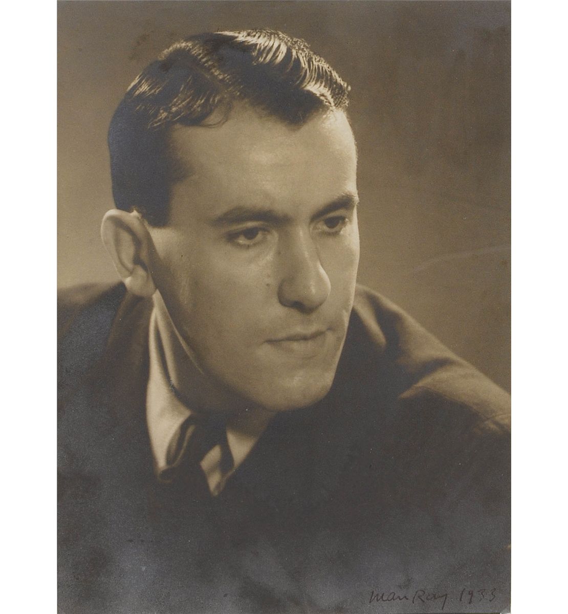 Influential American-born artist (1890–1976) who carved out an important niche in the history of modern art with his pioneering Dadaist works and his distinctive photographs and solarized photographic images dubbed ‘rayographs.’ Vintage matte-finish 6.75 x 8.75 portrait by Man Ray of the surrealist poet Rene Char, signed in the lower right in black ink, “Man Ray 1933.” Stamp from the Man Ray’s famous Montparnasse studio to the reverse reads: “Man Ray, 31 Bis, Rue Campagne-Premiere, Paris—14e.” Silvering to dark areas of the image, a tack hole to the top border, and some light contrast to the signature, otherwise fine condition. Man Ray took this portrait quite early in Char’s career, shortly before he published his first major collection of verse, entitled Le marteau sans maitre. A lovely, unusually traditional photograph from one of the most recognizable artists of the 20th century.