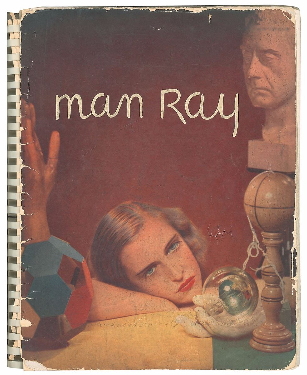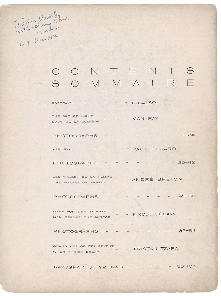 Signed book: Photographs 1920–1934 Paris. Second edition. Hartford: James Thrall Soby, 1935. Comb-bound softcover, 10 x 12, 104 pages. Signed and inscribed on the table of contents in fountain pen, “To Sister Dorothy, with all my love, Man, N. Y. Dec. 1936.” Several pages detached (including front and back covers, title page, and signed page), significant wear and small tears to edges, and light soiling, otherwise very good condition. Accompanied by an unsigned program for a 1945 Man Ray exhibition at Julien Levy Gallery in New York.