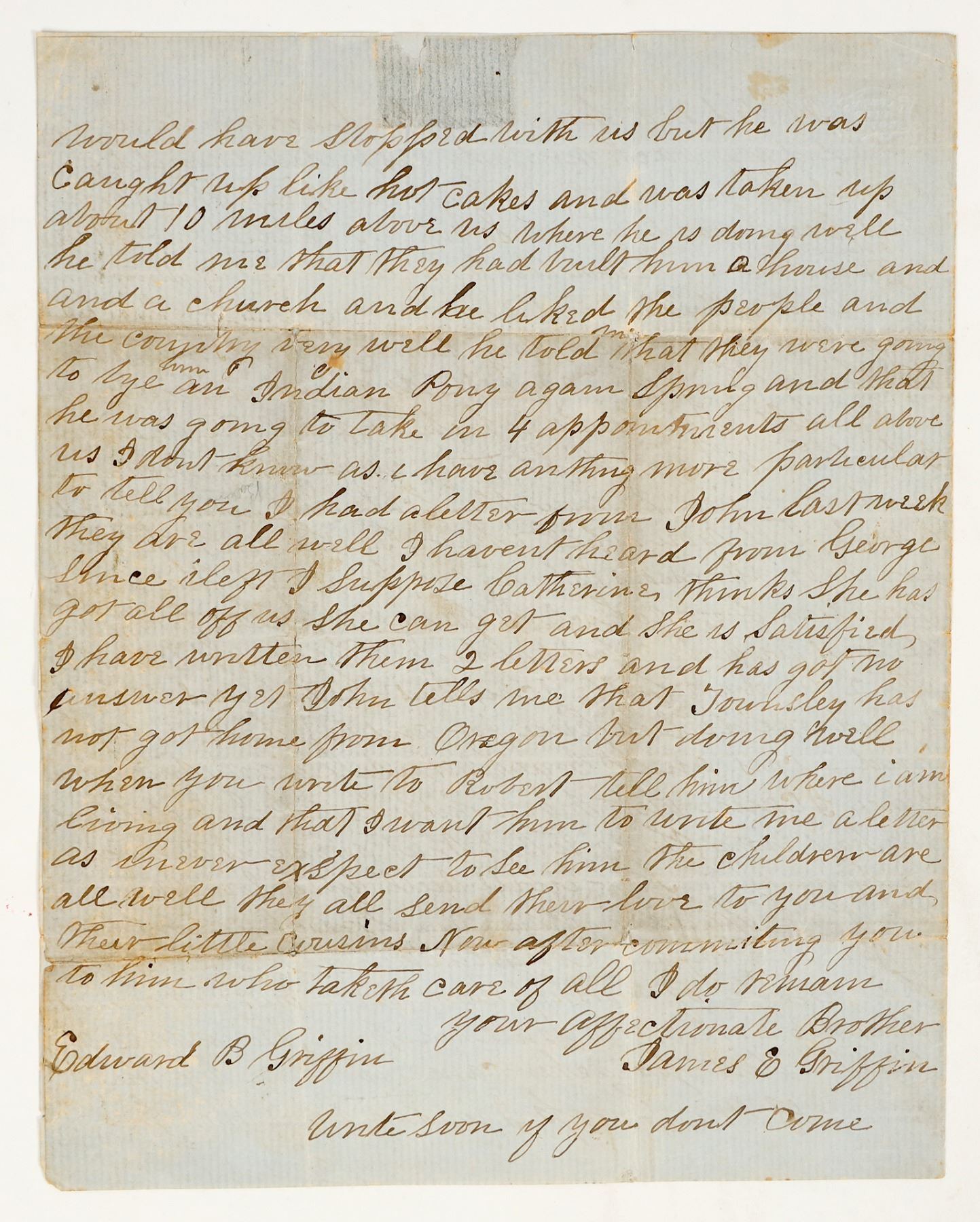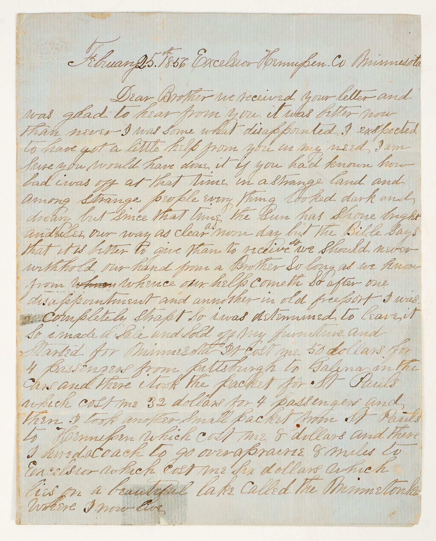 1856 letter from one brother to another about how he sold everything had and brought his wife and two children, traveling over 8 miles of prairie and to settle the costs to settle in a new area . Lake Minnetonka. The letter states he would sell some of his land to his brother if he decided to come out. In excellent cond.