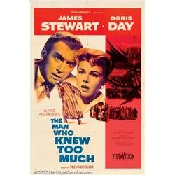 Man Who Knew Too Much, The (Paramount, 1956). One Sheet (27" X 41"). Doris Day and Jimmy Stewart star in this remake of Alfred Hitchcock's original 1934 classic. The climactic scene with the orchestra still holds up today. Fine. Important notice: We expect to be auctioning lots at the rate of 200-250 per hour. Sometimes eBay Premier live bid software cannot keep up with that pace, so we strongly recommend that you place a realistic proxy bid now as insurance to avoid disappointment. Also please note that all Heritage/CAA lots purchased through eBay Premier carry a 20% Buyer's Premium.