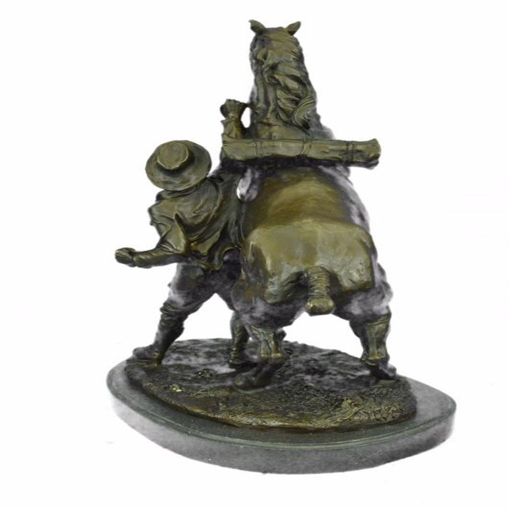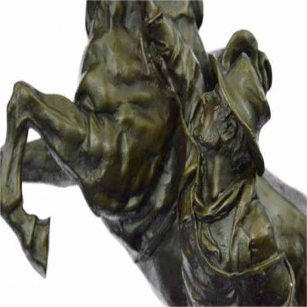 The Western cowboy grabs the reins on his horse. The excited horse rears in a heated moment, lifting its front legs in the air. The brave cowboy is attempting to calm this horse from his excited state. A rearing horse can be a danger. The detail on this exquisite Sculpture features the groves and musculature of the horse and of the cowboy in his typical western clothing. This Sculpture was crafted using the lost wax method and rests on a marble base. Dimensions: Height 16 X Width 12 inches. Weight: 23 LBS.
