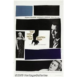 <B>Man With the Golden Arm (United Artists, 1955)</B></I> One Sheet (27" X 41"). Frankie Machine (Frank Sinatra) is fresh out of prison and doing his best to go straight. His supposedly wheelchair-bound wife (Eleanor Parker) is demanding that he give up his dream of drumming and continue in the card-dealing job that brings in money. When he's asked to deal a big poker game, he feels that he needs drugs to get his edge back. After he is accused of the murder of his drug dealer, he finds that he has to come down cold turkey off his high with the help of Kim Novak. A very clean one-sheet with Saul Bass art for this intense Otto Preminger film. Very light fold wear and one slight scuff in a corner of the artwork. Otherwise, this would be a mint poster. Near Mint.