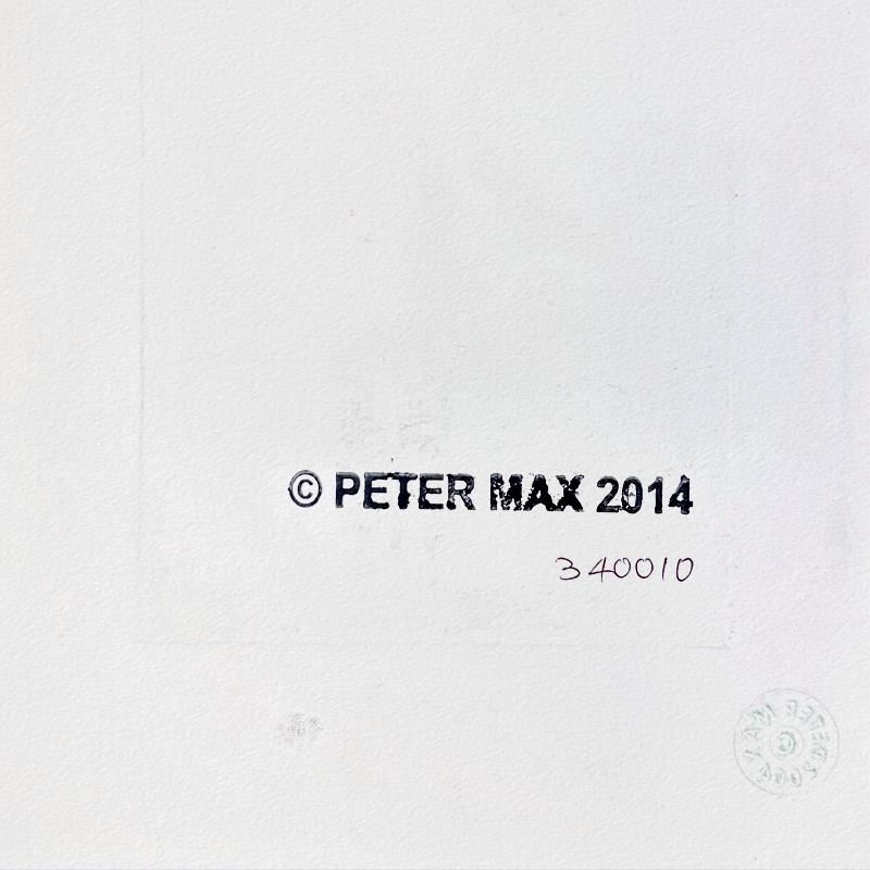 Man at Easel is a one-of-a-kind mixed media on paper, hand signed by Peter Max. The piece comes custom framed with a backside cutout to display Peter Max Studio registration number 340010 certifying authenticity. Measures approximately 23 x 21 (frame), 9 x 7 (image).