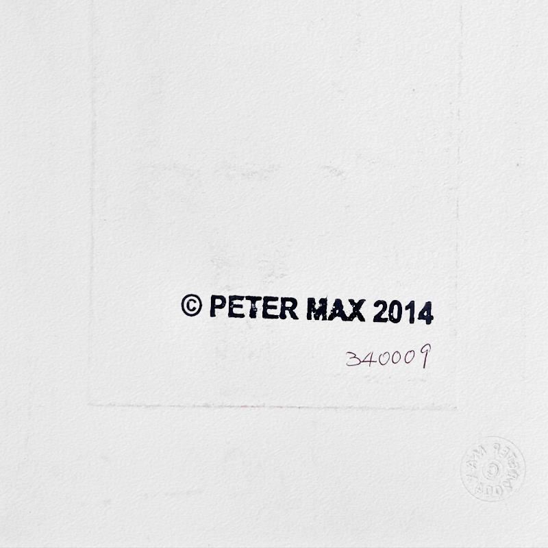 "Man at Easel" is a one-of-a-kind mixed media on paper, hand signed by Peter Max. The piece comes custom framed with a backside cutout to display Peter Max Studio registration number 340009 certifying authenticity. Measures approximately 23" x 21" (frame), 9" x 7" (image).