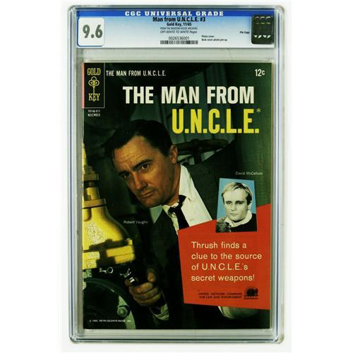 <B>Man from U.N.C.L.E. #3 File Copy (Gold Key, 1965) CGC NM+ 9.6 Off-white to white pages.</B></I> This Solo effort will cure the things that Illya, so T.H.R.U.S.H., don't walk, to the auction room to bid on this 9.6 copy with a photo cover. Overstreet 2006 NM- 9.2 value = $90. CGC census 3/06: 2 in 9.6, 1 higher. <I>From the Random House Archives.</B></I>