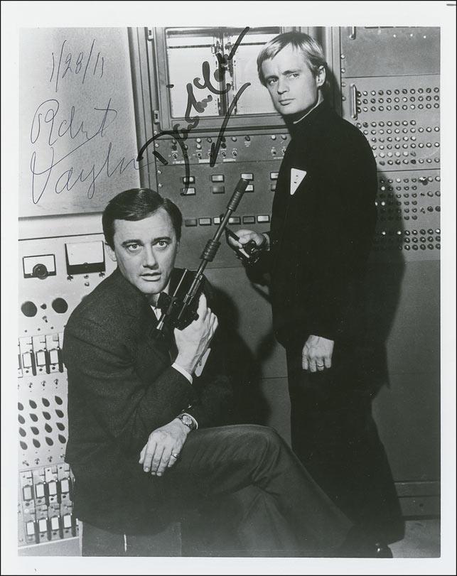 Glossy 8 x 10 photo from the show, signed in black ballpoint by Robert Vaughn, dated “1/28/11,” and in black felt tip by David McCallum. In fine condition.