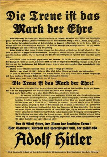 Man of German Loyalty. Another broadside in the "second round" election between Hitler and von Hindenburg in April 1932. Printed one side, black on tan paper, attempting to present Hitler as a veteran, "not accepting benefits, twice wounded...always looking out for Germany's sake...He will free the German nation...with his endless loyalty, bought in his blood...." A more subdued tool in electioneering, to attract the conservative votes away from Hindenburg. V.F. Scarce.
