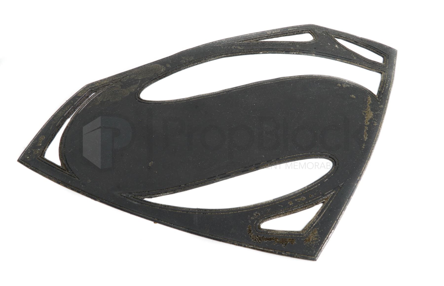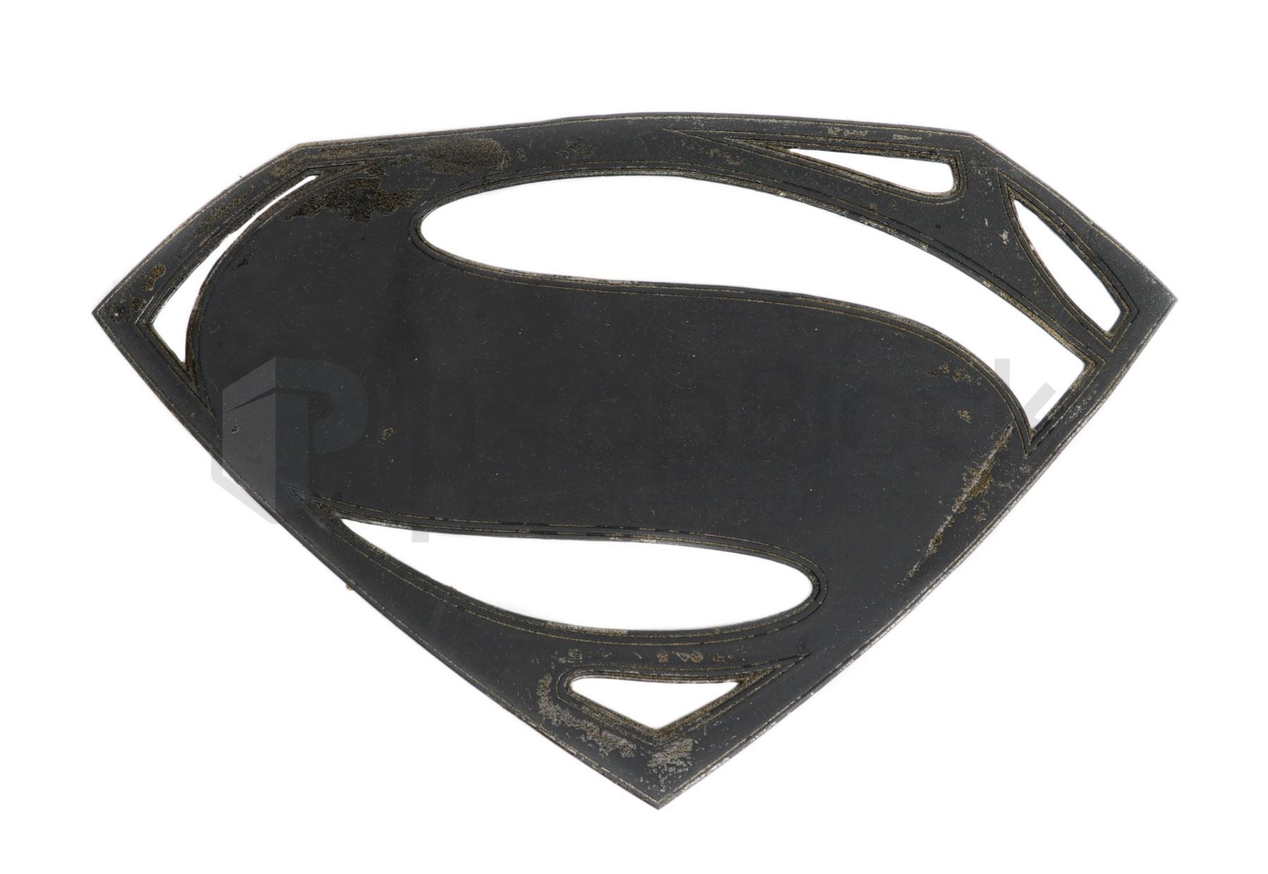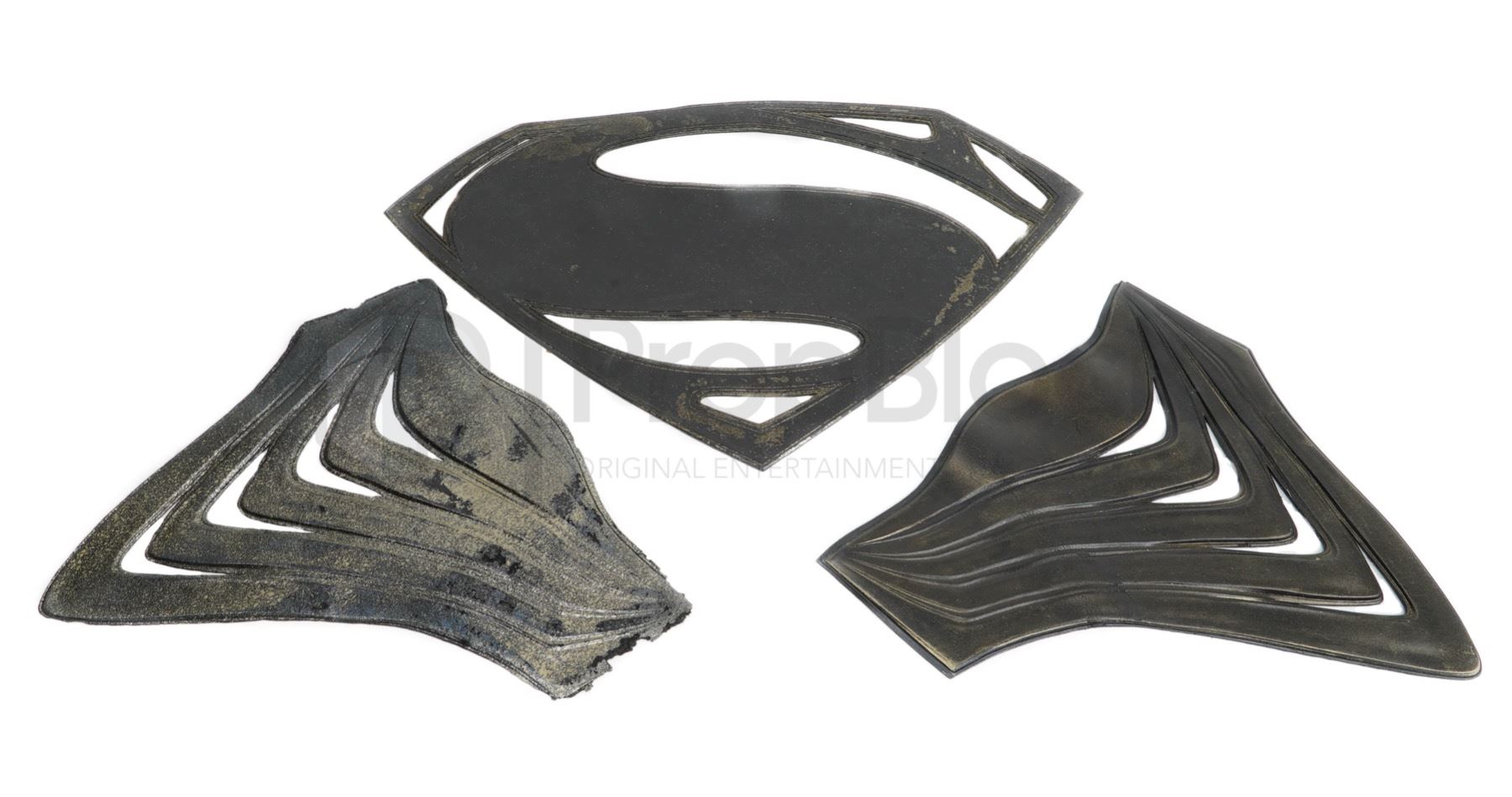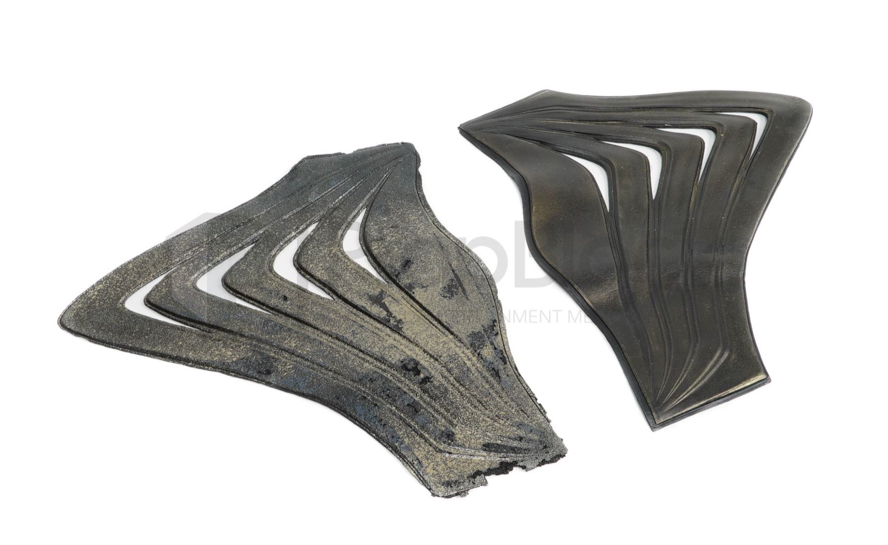 Set consisting of a chest glyph and two waist details made for use on the alien Kryptonian costumes featured in the DC superhero film The Man of Steel. These pieces are made of foam latex and are all black in color with hues of gold detailing. This set remains in excellent, production made condition.