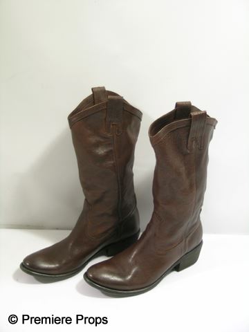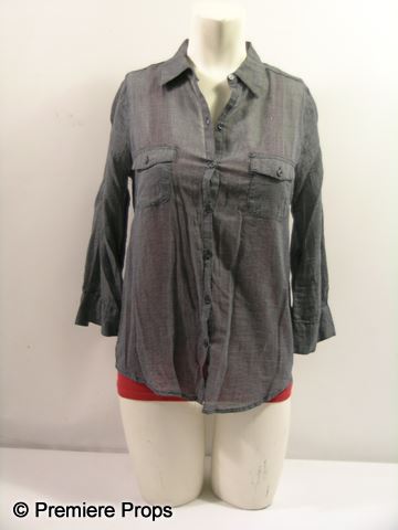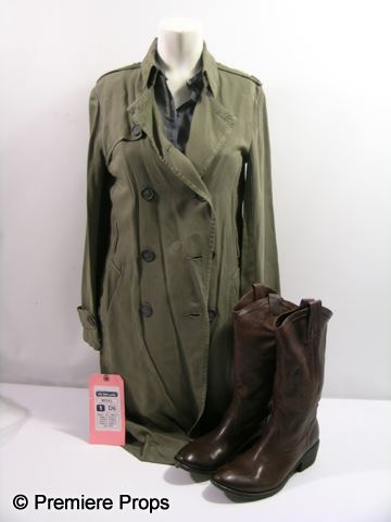 Lydia Mercer (Elizabeth Banks) double's, hero, rigged with hole in the back, taupy tan soft broken cotton knee length with belt 'Comptoir des Cotoniers' trench coat, (size 36) navy with white cotton very fine weave button front with collar 'BDG' blouse, (size XS) ribbed cotton salmon 'Levis' tank top, (size XS) and brown slouchy leather 'Fry's' boots. Includes wardrobe tag!