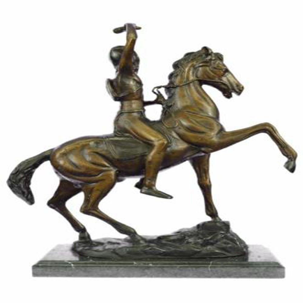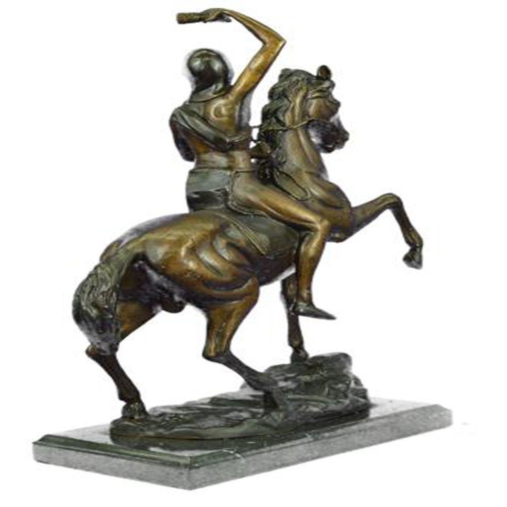 A proud Indian gallops atop his horse, returning home with evidence of his won battle in the desert. He sits high and thrusts a scalp into the air. His long silky hair falls down the line of his back and he wears only a loincloth around his waist. This two toned brown patina Sculpture was cast using the Lost Wax Method and mounted on a marble base. Bronze Dimensions with Marble Base: Height 19 X Width 21 inches. Weight: 22 LBS.