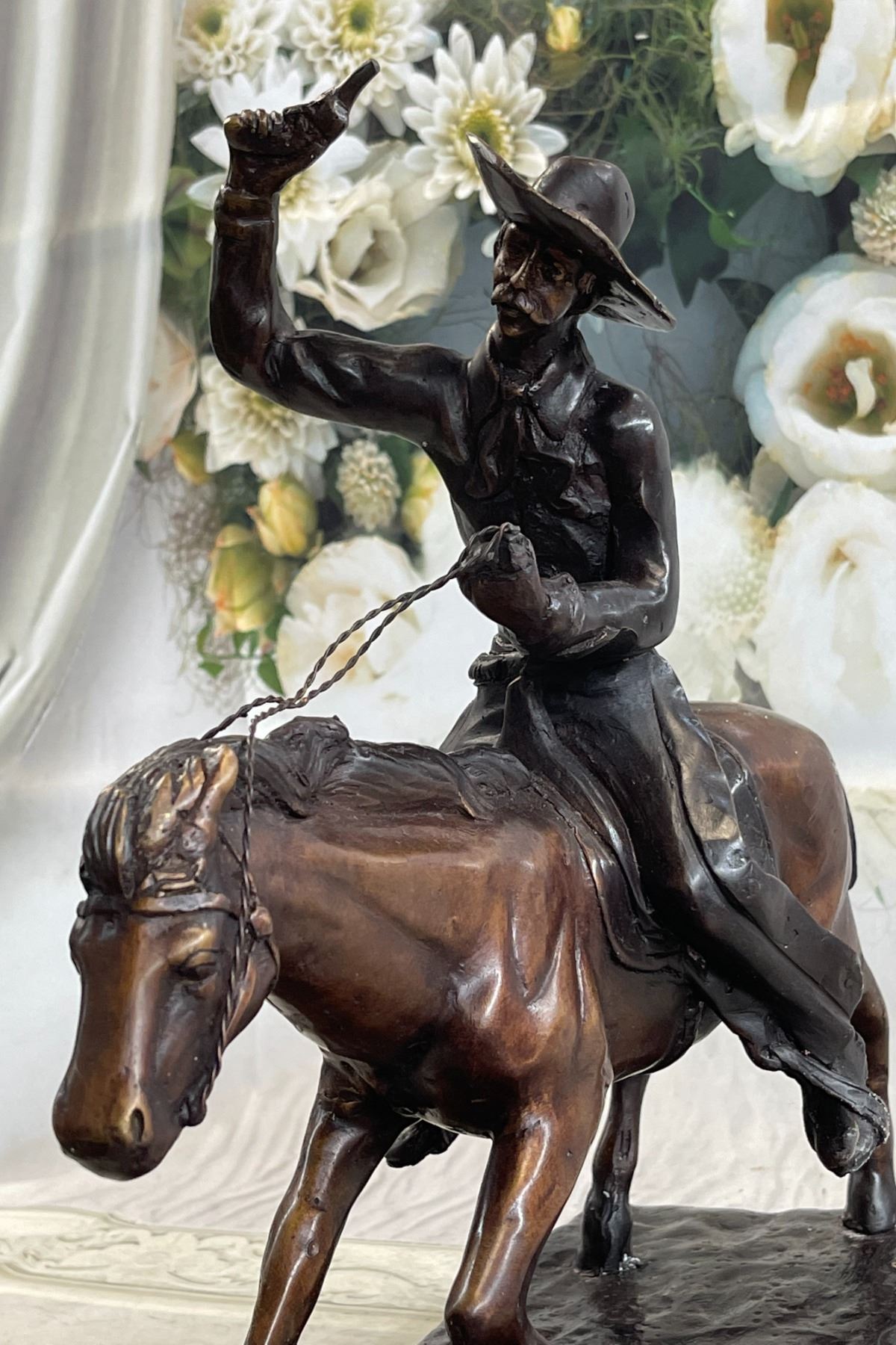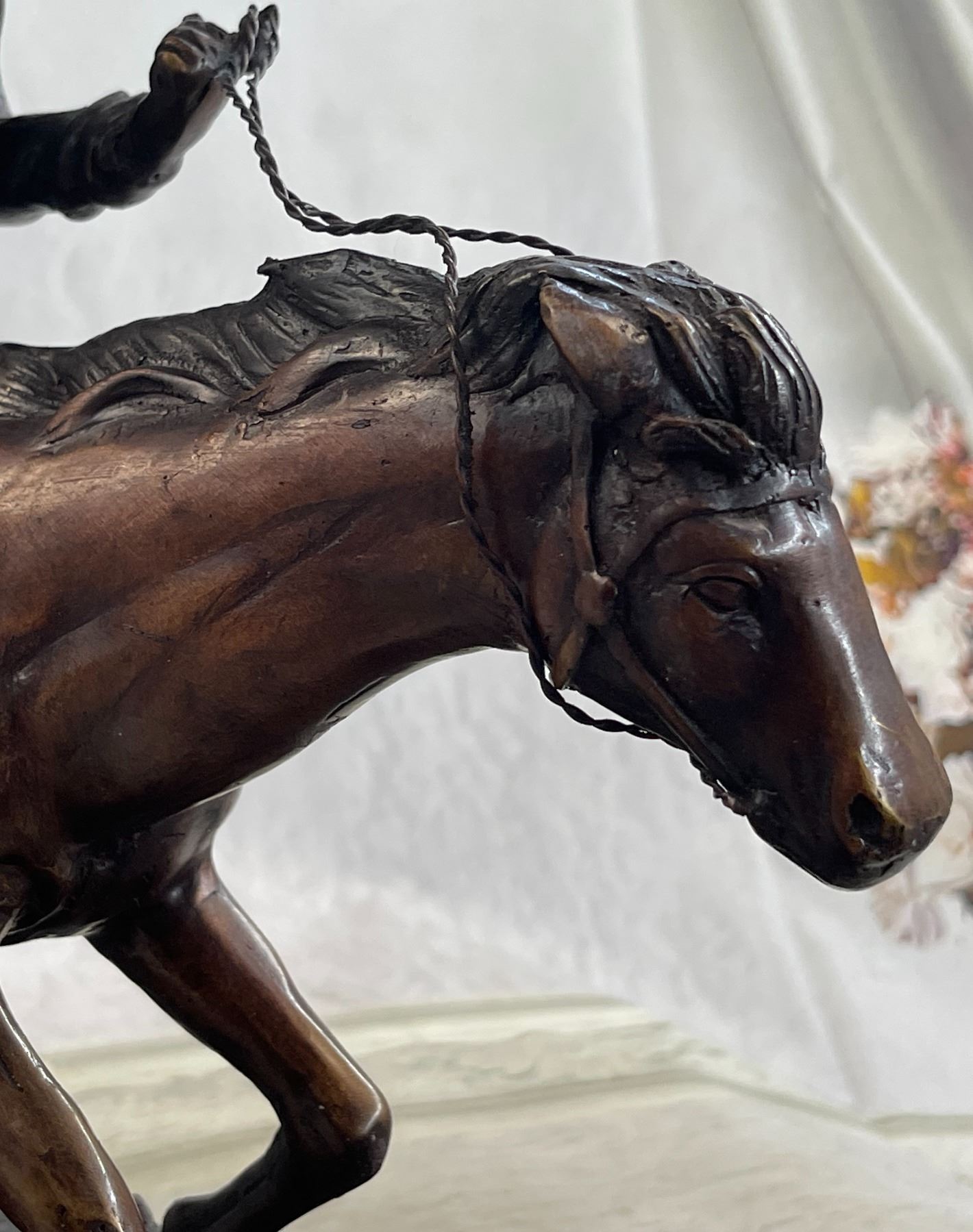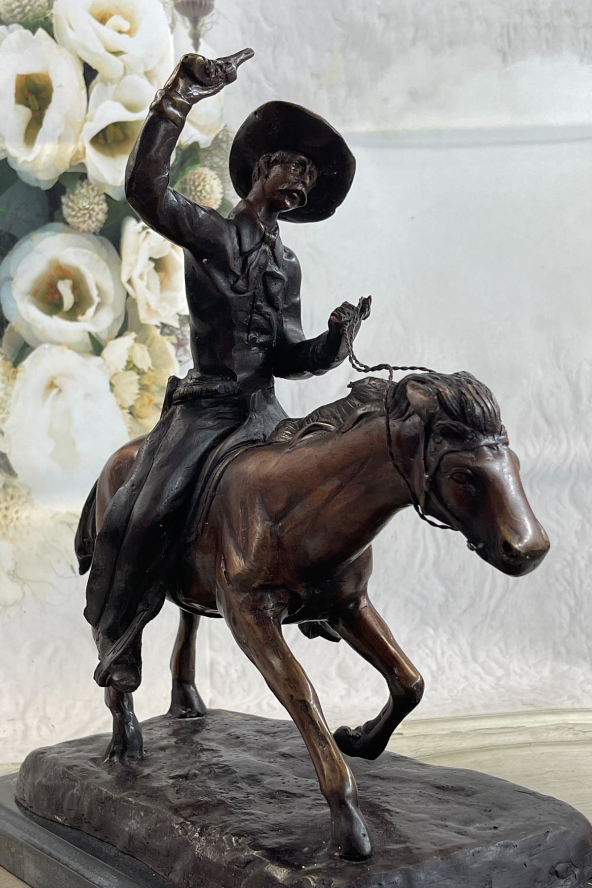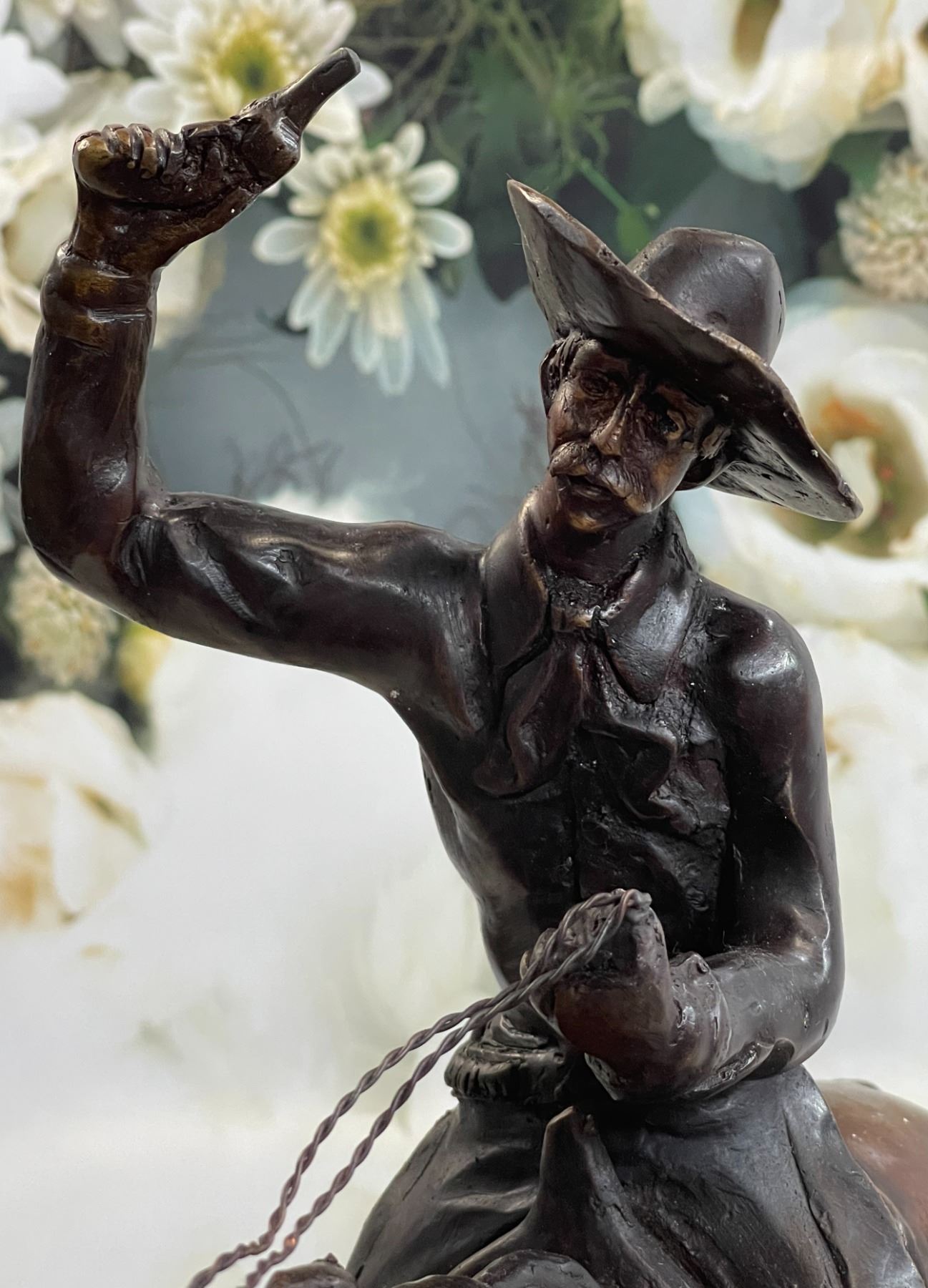 This is a statue of a cowboy, revolver in hand, aimed at the sky as he rides on his trusty horse. He is dressed in blue jeans with chaps and a buttoned-up shirt with a bandana loosely tied around his neck. Around his waist hangs his belt, equipped with bullets and his holster. He wears an aged cowboy hat and has a thick handlebar mustache and a warn face. In his left hand, he grips roped reigns as his horse races forward at a full gallop. The detailing is remarkable, from the horse mane to the man expression. Here they use have used the Lost Wax Method to create this piece and have a two-toned brown bronze patina. Dimensions: Height 15 X Width 17 inches. Weight: 14 LBS.