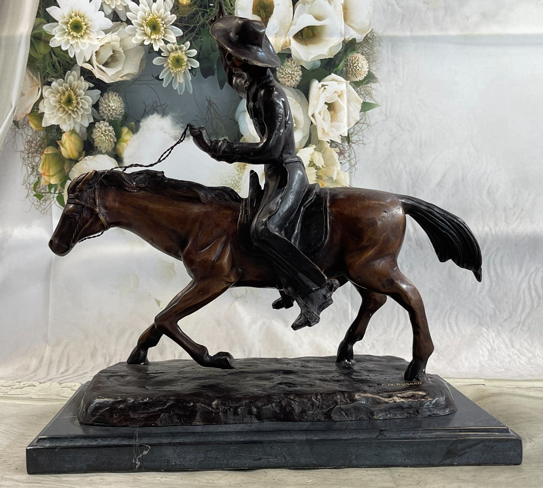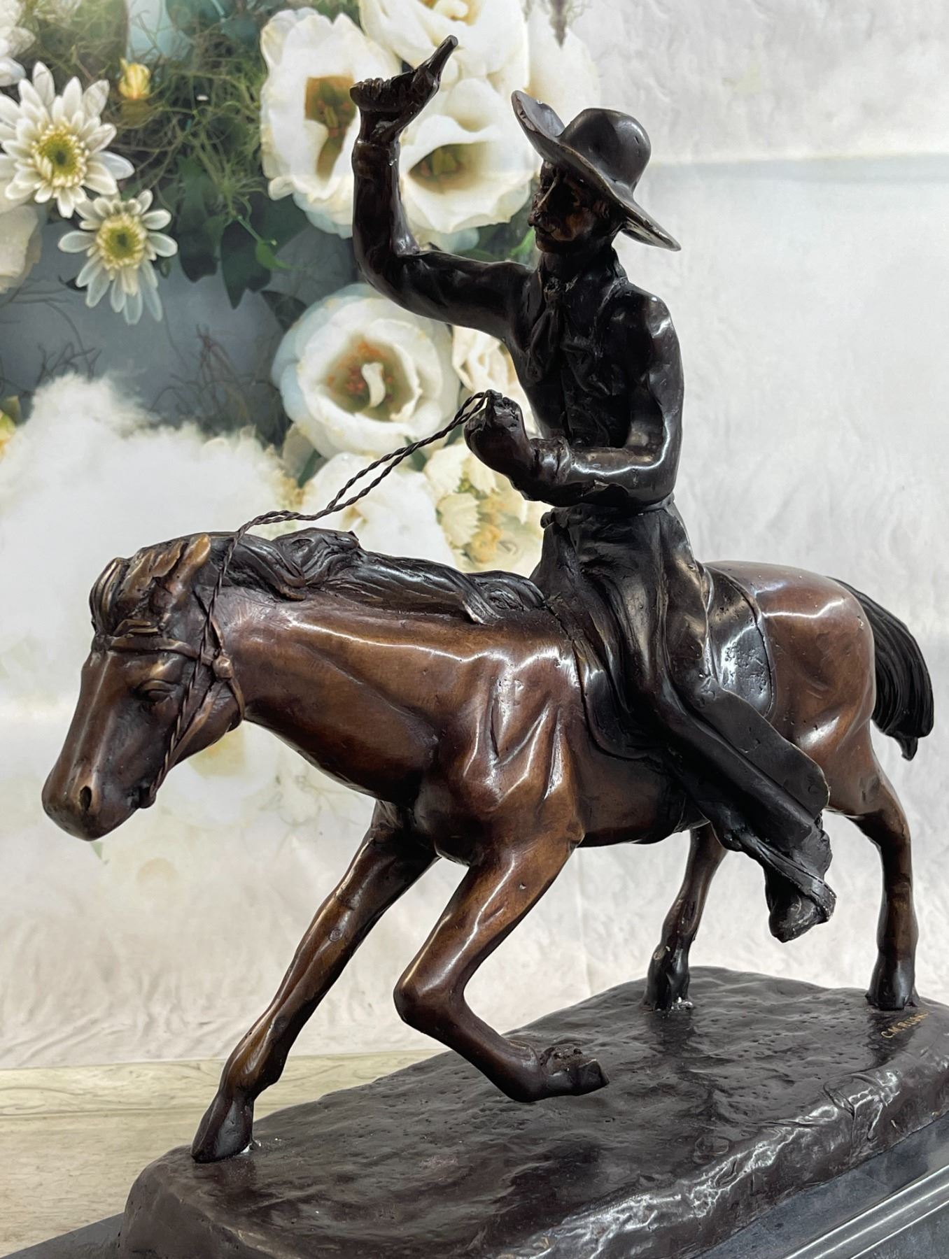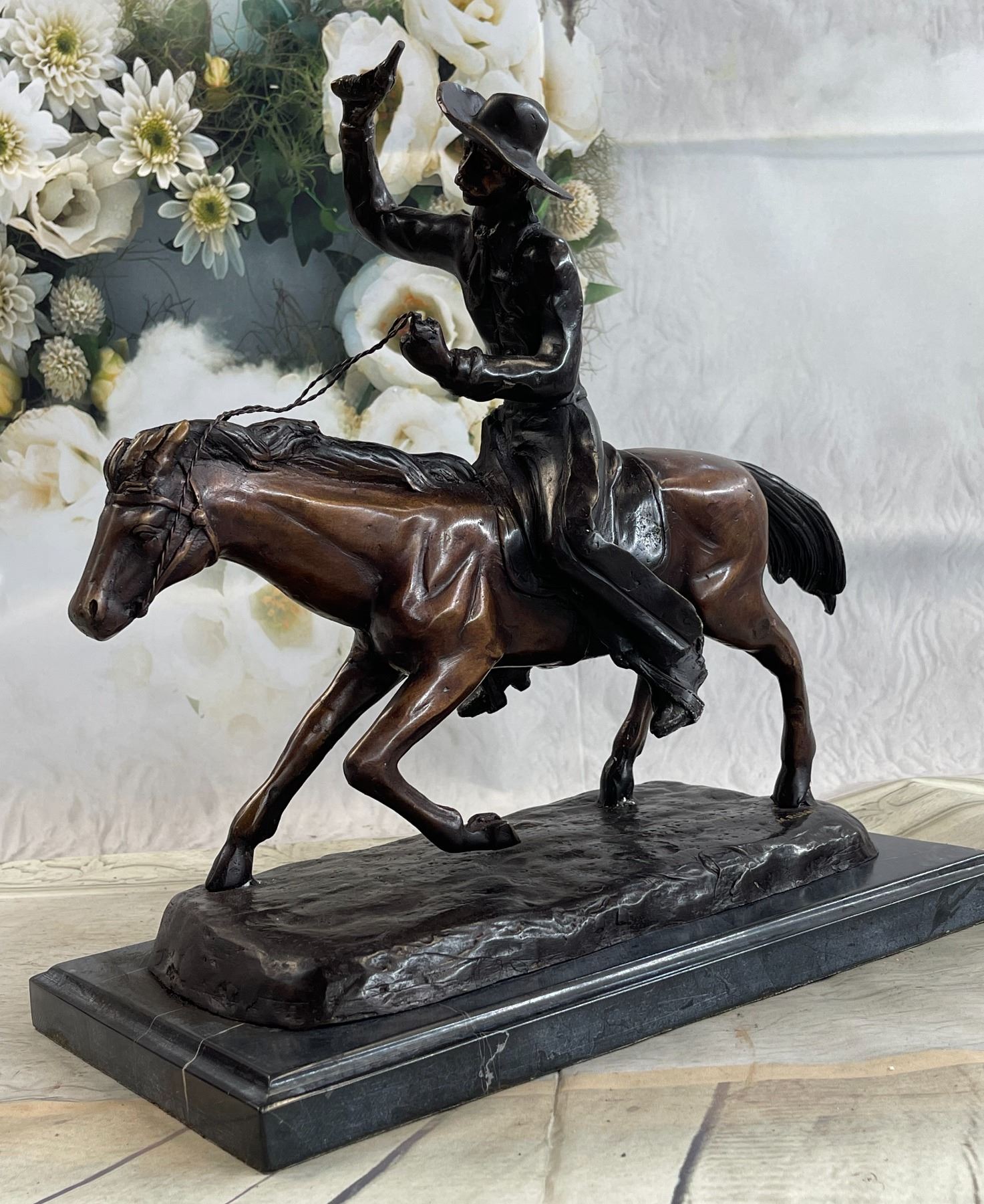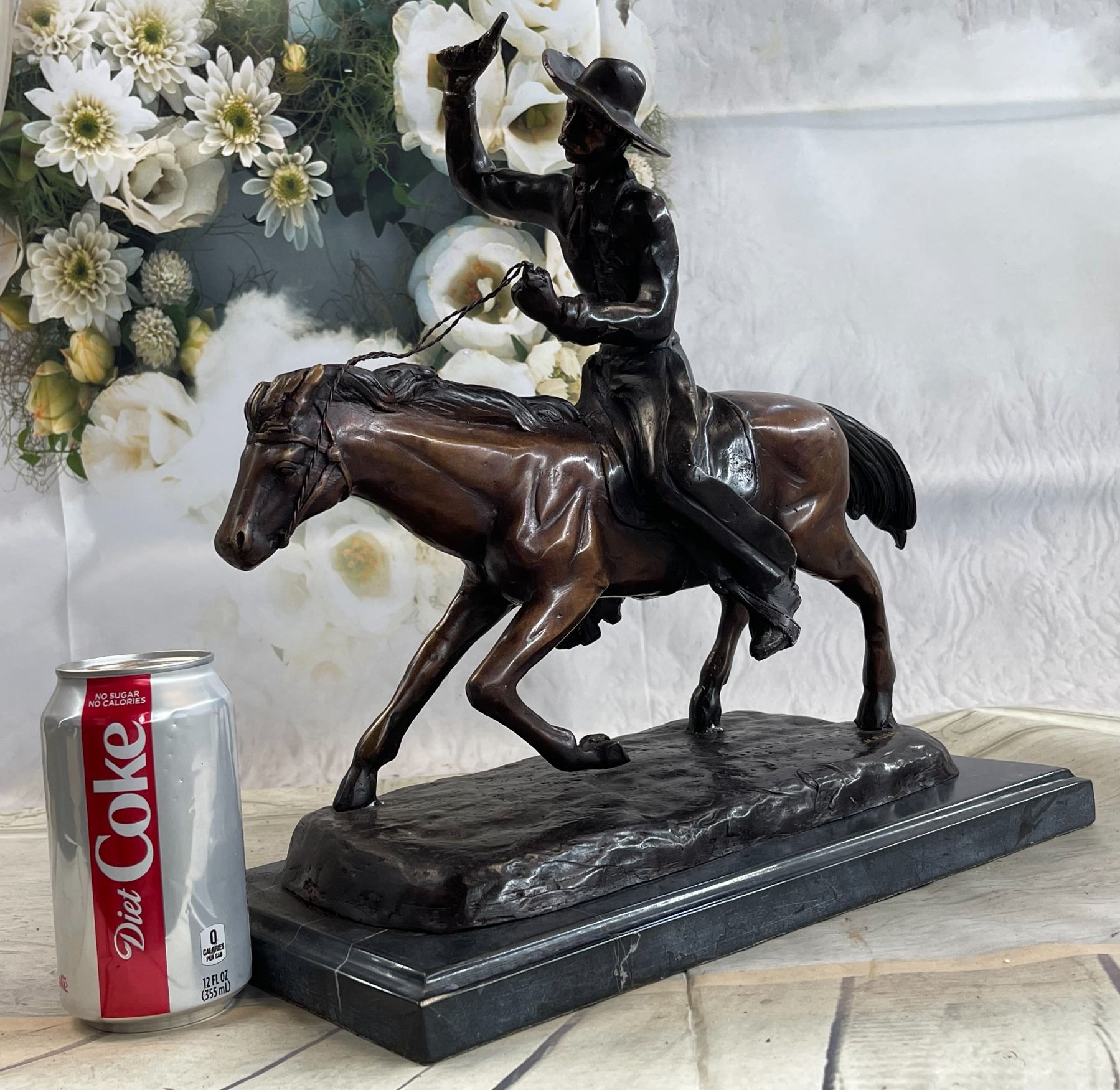 This is a statue of a cowboy, revolver in hand, aimed at the sky as he rides on his trusty horse. He is dressed in blue jeans with chaps and a buttoned-up shirt with a bandana loosely tied around his neck. Around his waist hangs his belt, equipped with bullets and his holster. He wears an aged cowboy hat and has a thick handlebar mustache and a warn face. In his left hand, he grips roped reigns as his horse races forward at a full gallop. The detailing is remarkable, from the horse mane to the man expression. Here they use have used the Lost Wax Method to create this piece and have a two-toned brown bronze patina. Dimensions: Height 15 X Width 17 inches. Weight: 14 LBS.