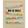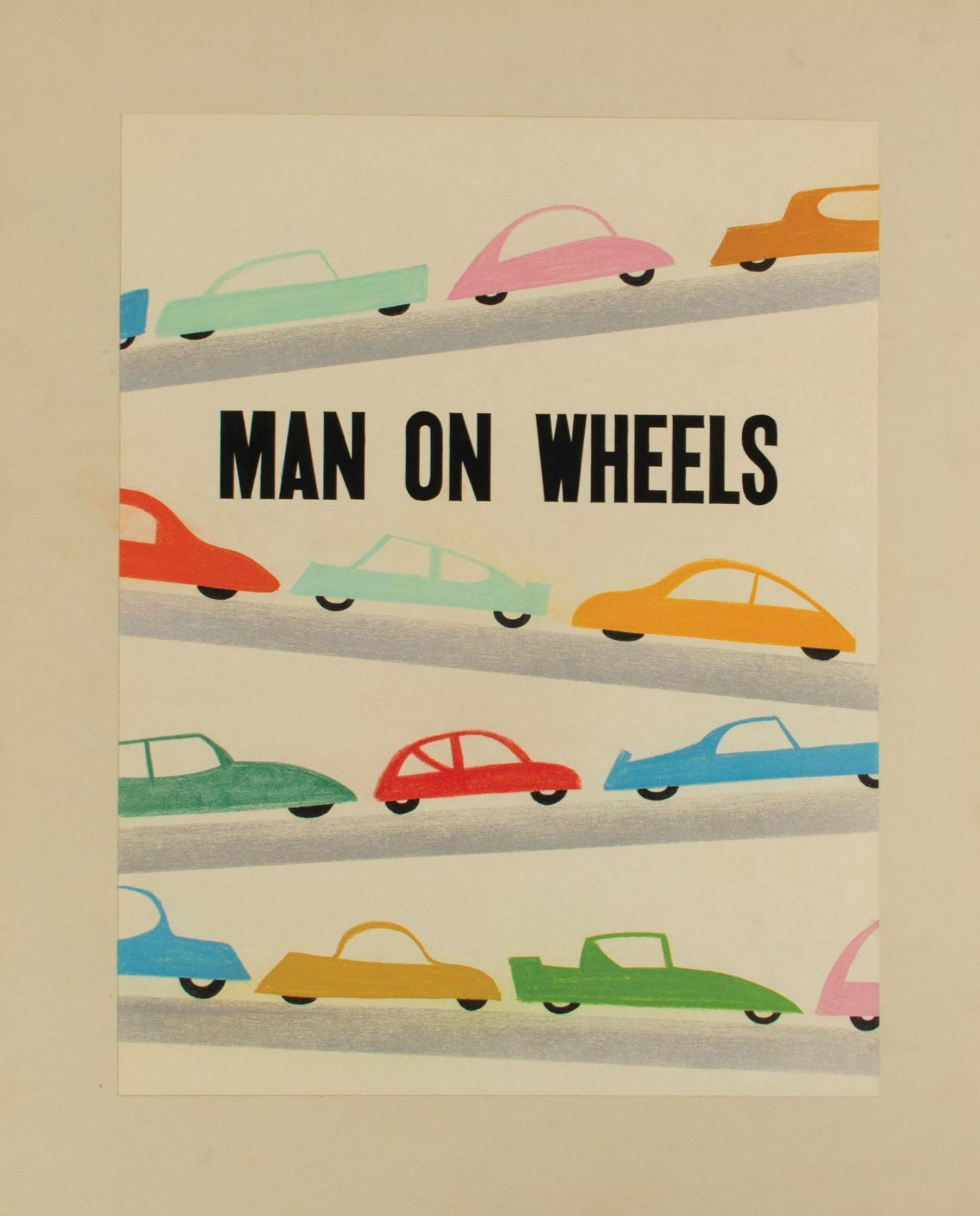 (L.W. Singer, 1959) An original concept design for the cover of a Disney illustrated educational book titled "Man on Wheels". This concept was likely created for Disney's popular Tomorrowland Adventure Series of books in 1959, which contain similar themes, titles, and imagery to this concept design. This large original artwork is accomplished in paint and conte on artist's paper that is mounted to board. The artwork measures 18"x14" on the 23.25"x18.75" artist's board. The condition is very good with minor wear around the edges of the board from use.